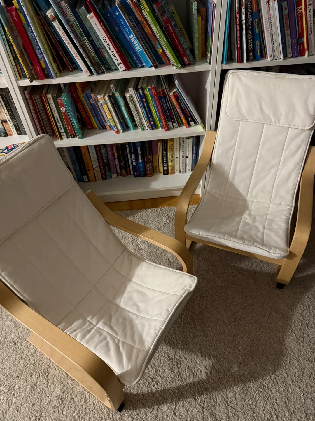 15Selling a pair of IKEA Poang chairs. They have a light wood frame and white cushions. These chairs are super comfy and would be a great addition to any living room or chill space. $20 each.