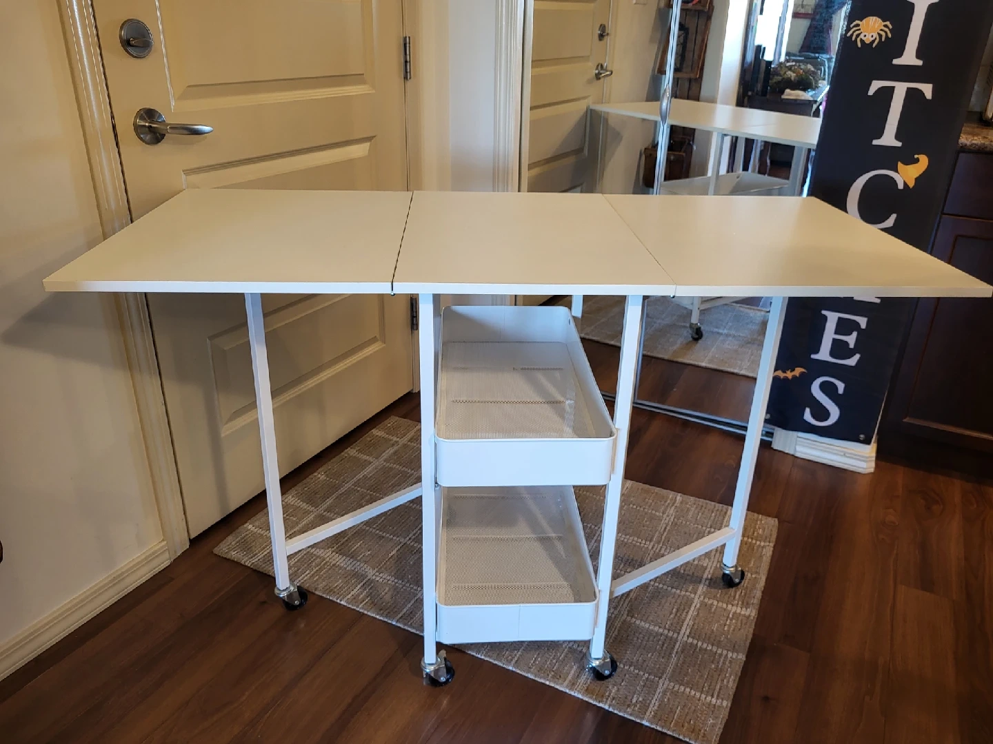 Selling a handy white folding drop leaf table! It's perfect for small spaces and easy to store when not in use. It also has a built-in storage rack with two shelves for extra convenience