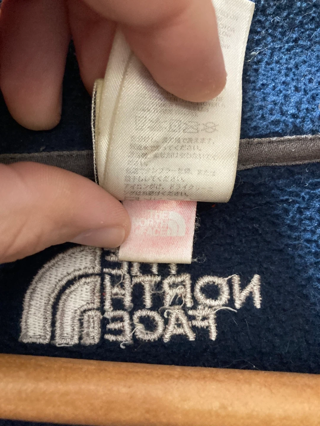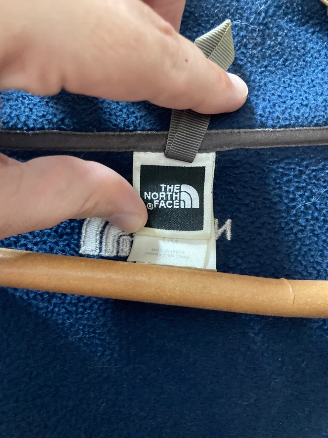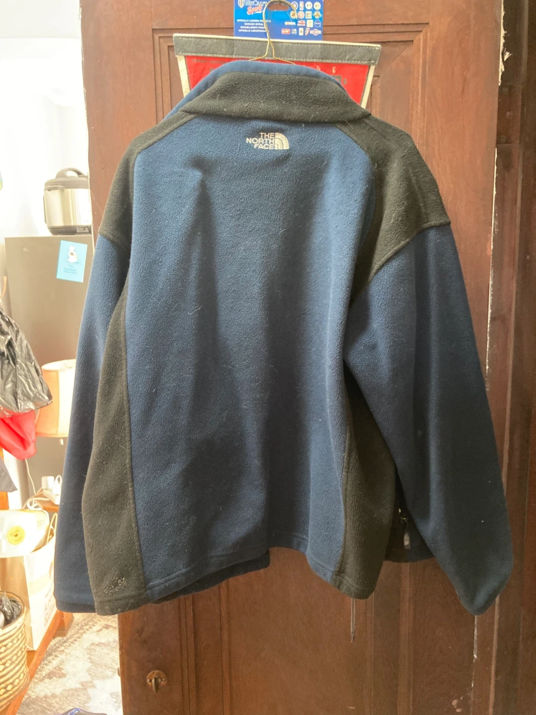 65Selling a The North Face fleece jacket in blue and black. It shows signs of wear. Fits a little big