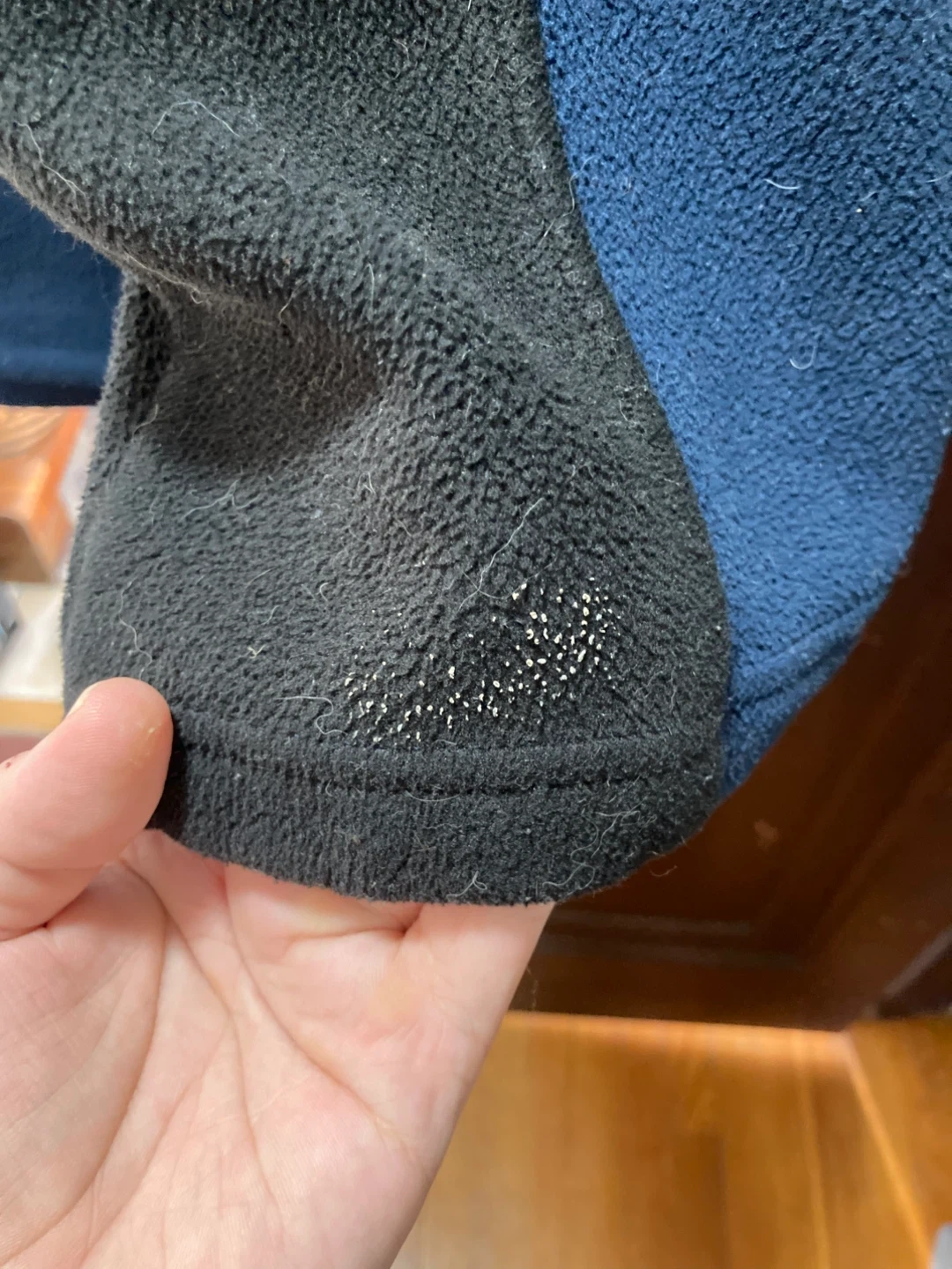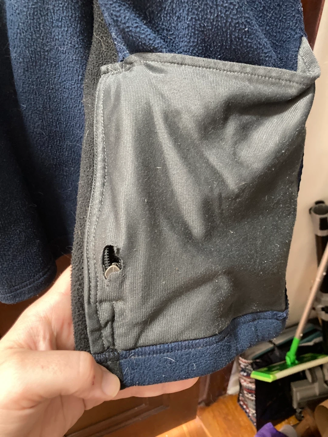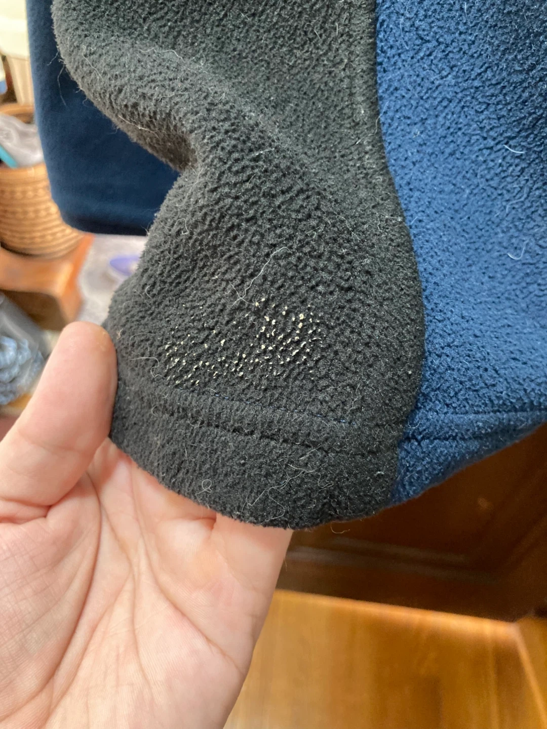 65Selling a The North Face fleece jacket in blue and black. It shows signs of wear. Fits a little big