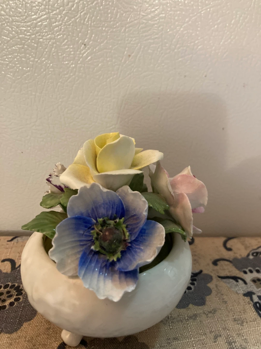 This is a lovely floral arrangement in a white ceramic pot. The flowers are a mix of colours, including yellow, blue, pink, and purple. It's in great condition and would look great on a shelf or table. Made in Staffordshire, England