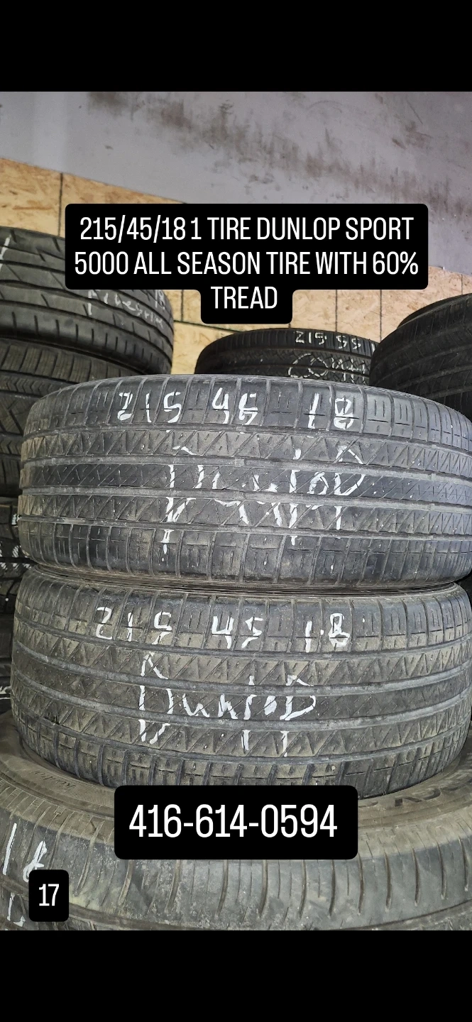 27$50 EACH Selling a Dunlop Sport 5000 all-season tire, size 215/45/18. It has about 60% tread remaining, so it's still got plenty of life left! call 416-614-0594