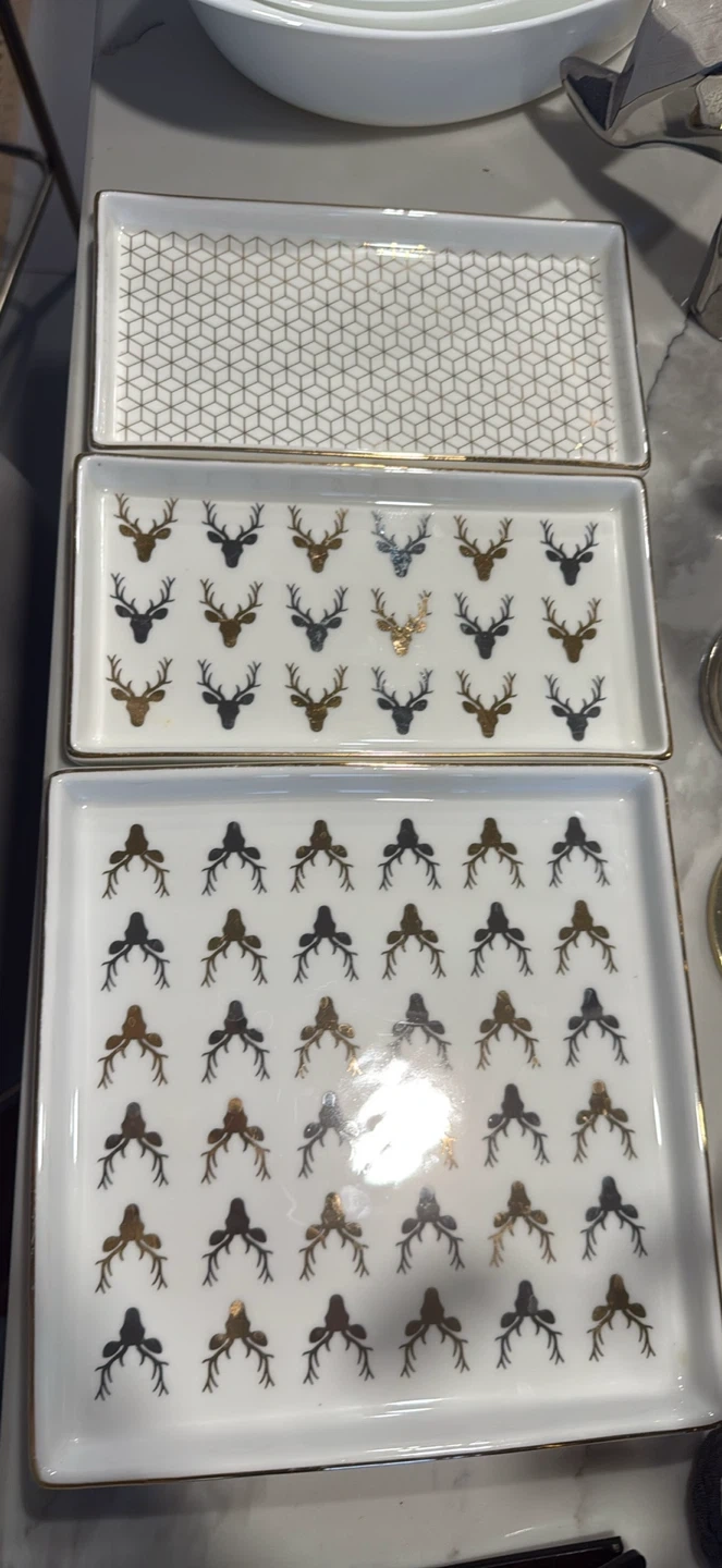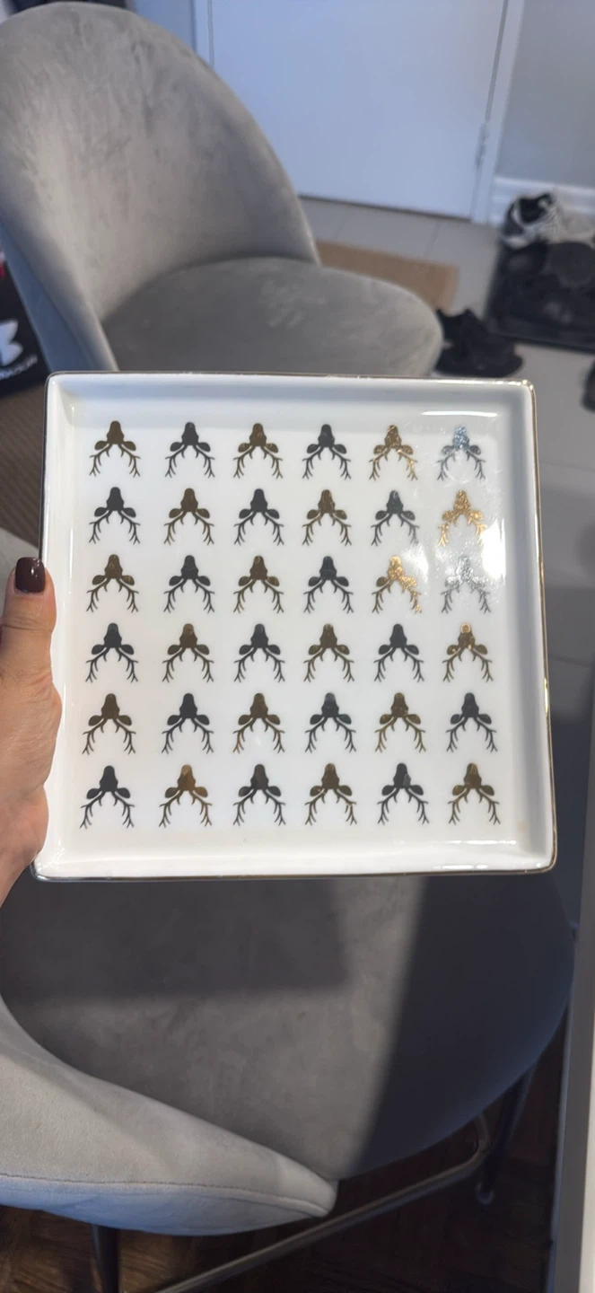 Selling a decorative rectangular tray with a unique design. It features a pattern of what appears to be deer antlers in varying colors. The tray has a gold trim, adding a touch of elegance to the piece. Perfect for adding a stylish touch to your home decor!