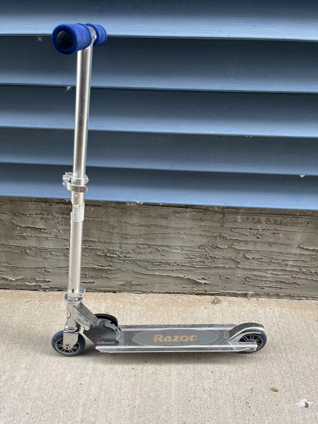 Selling a Razor scooter with blue handle grips. It's in good used condition and ready for a new owner to enjoy!