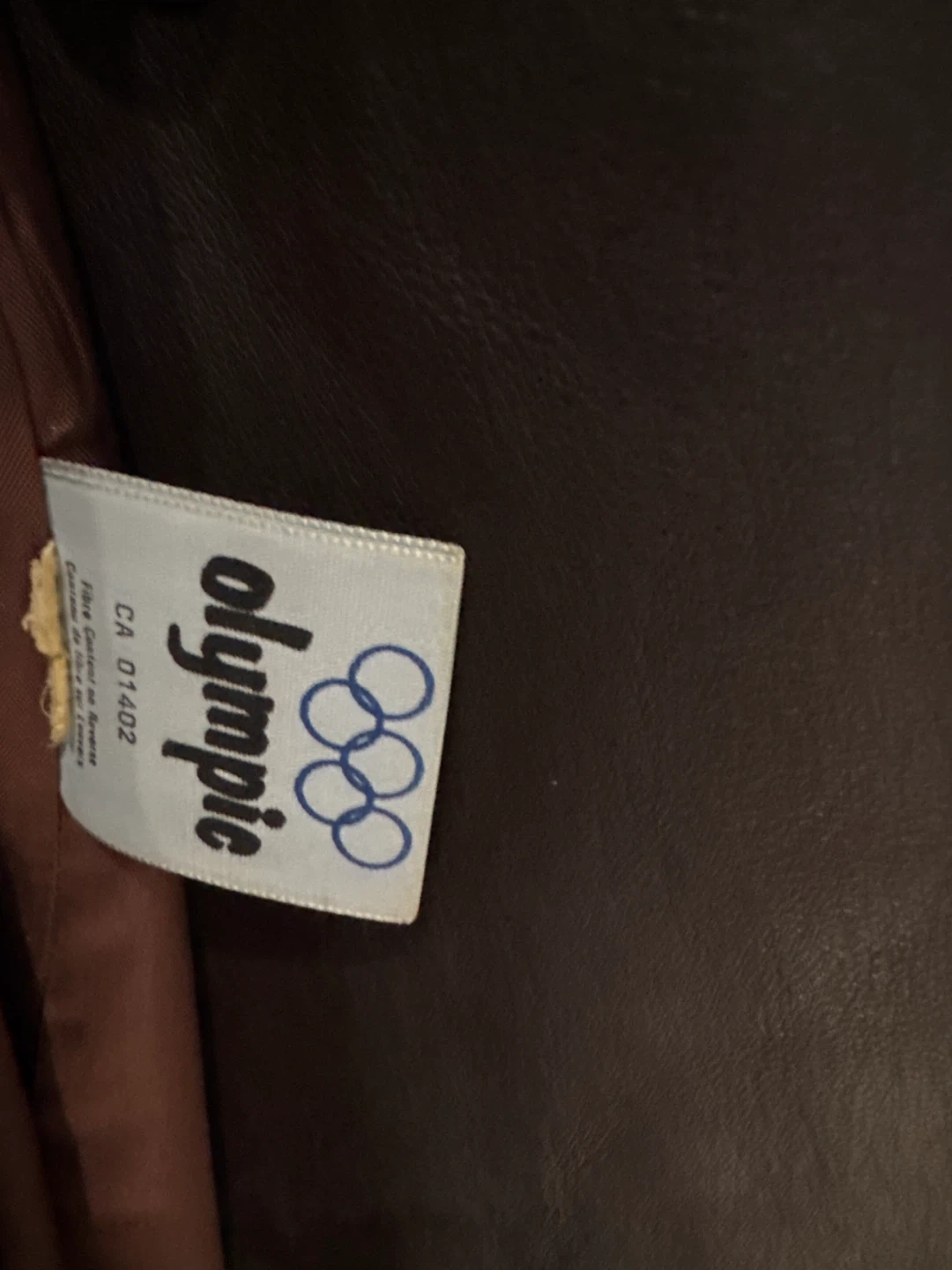 Selling a brown leather coat from Olympic! It's made of genuine leather with a suede and doublure lining. The lining is 100% acetate, and the fill is acrylic. The back and pockets are 100% cotton. This garment should be professionally dry cleaned only
