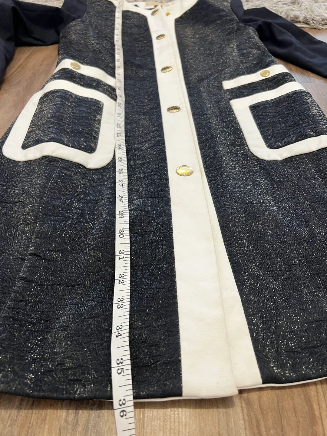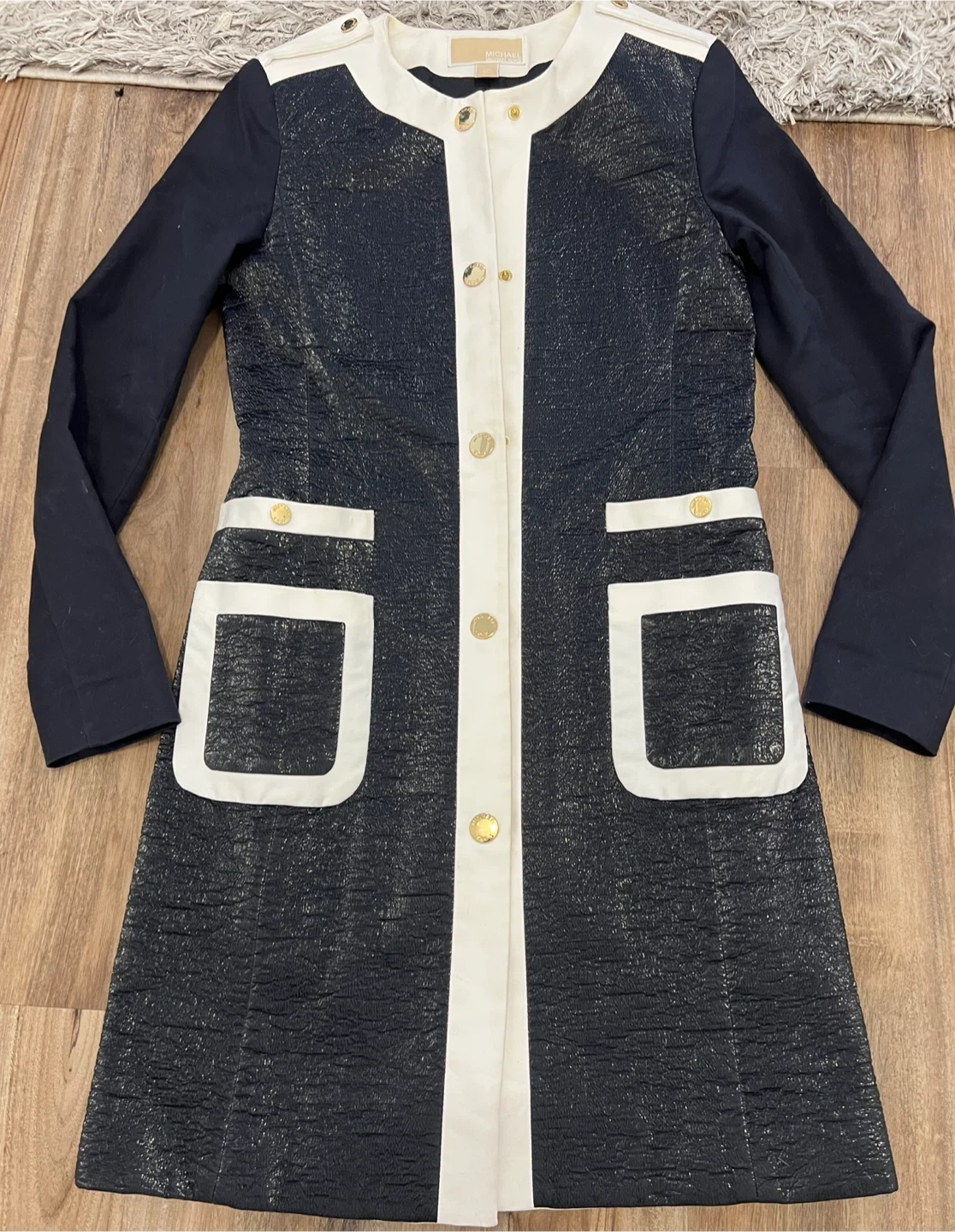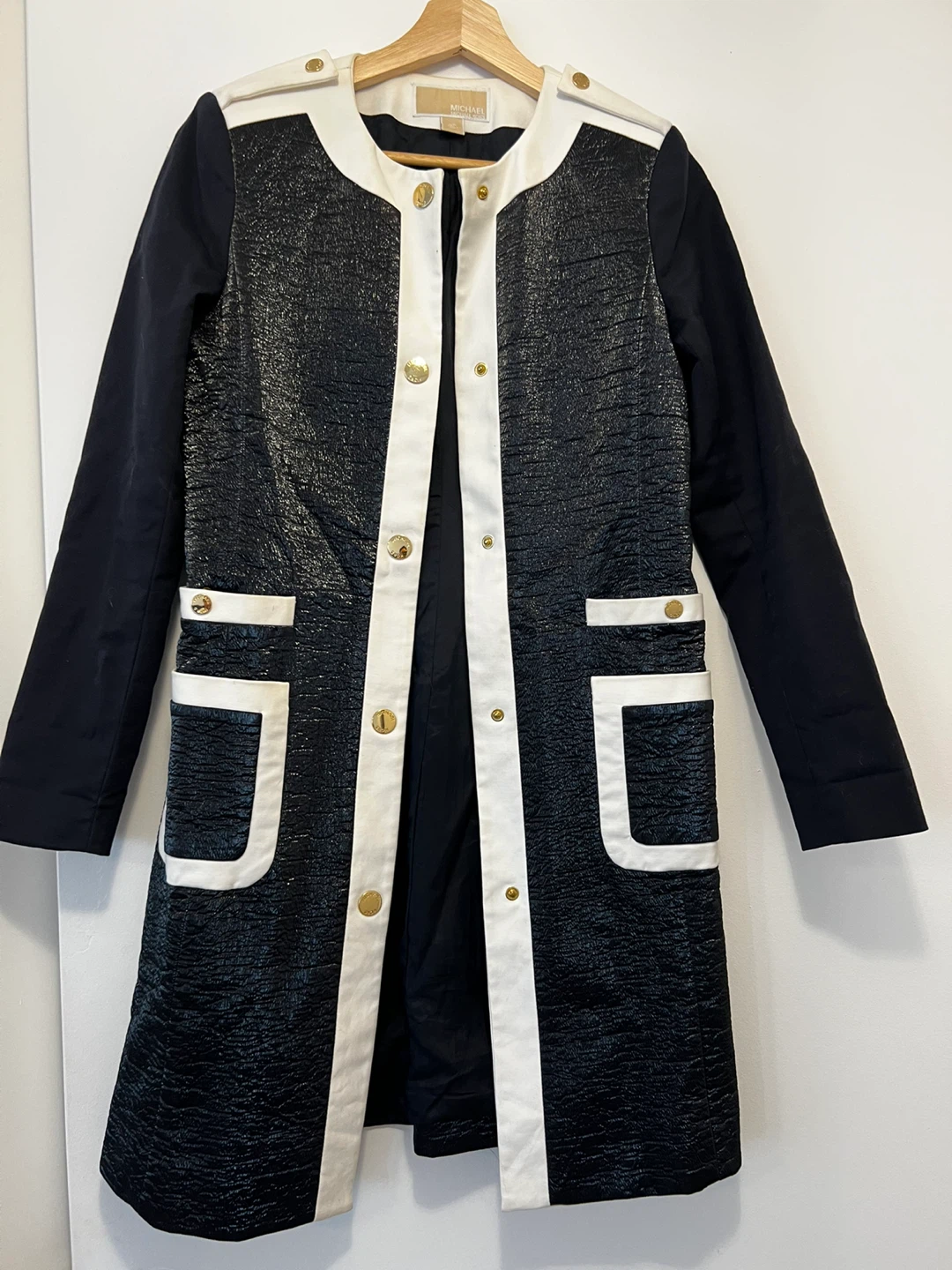 Here's a stylish Michael Kors coat. It features a unique 60’s Jackie Kennedy style with black and white accents and gold buttons. Perfect for adding a touch of elegance and versatility to your wardrobe.