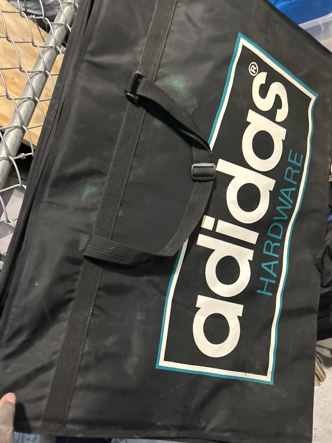 65Selling an Adidas shoe bag. It's black with the Adidas logo. It has some signs of wear, but it's still functional.holds 25 shoes
