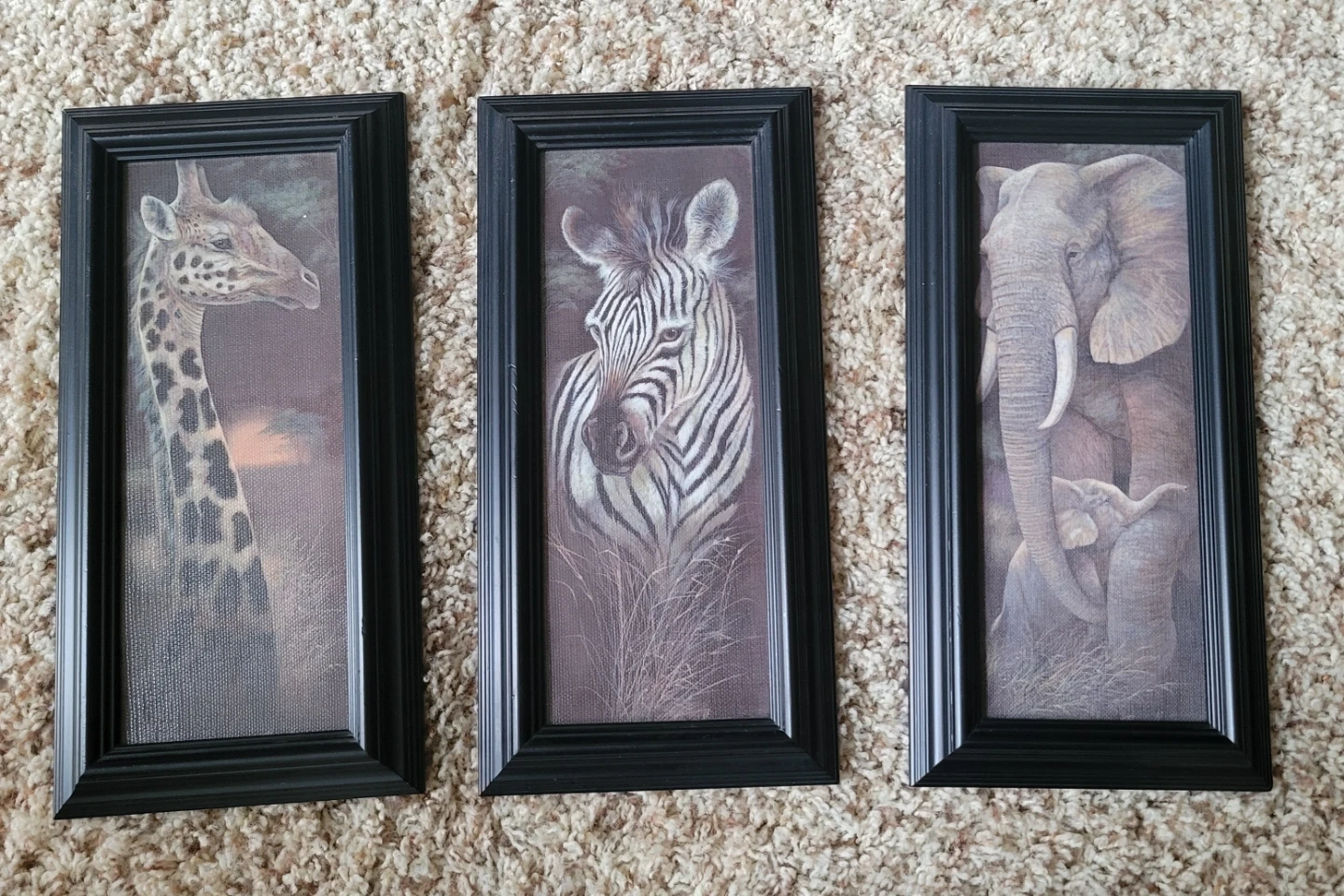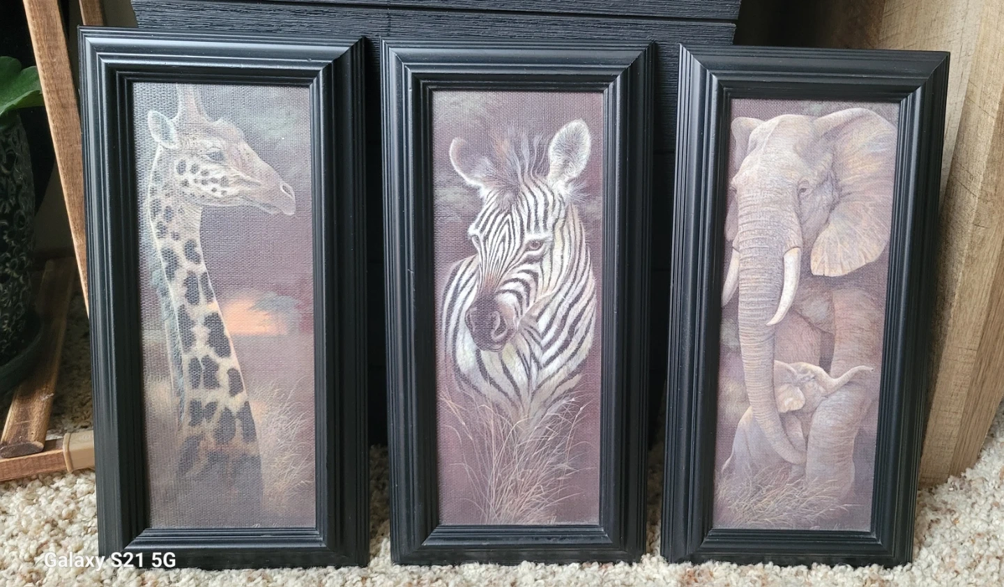 Selling a set of three Delta Graphics animal prints. They feature a giraffe, zebra, and elephant. Each print is ready to hang and measures approximately 5 inches wide and 12 inches tall
