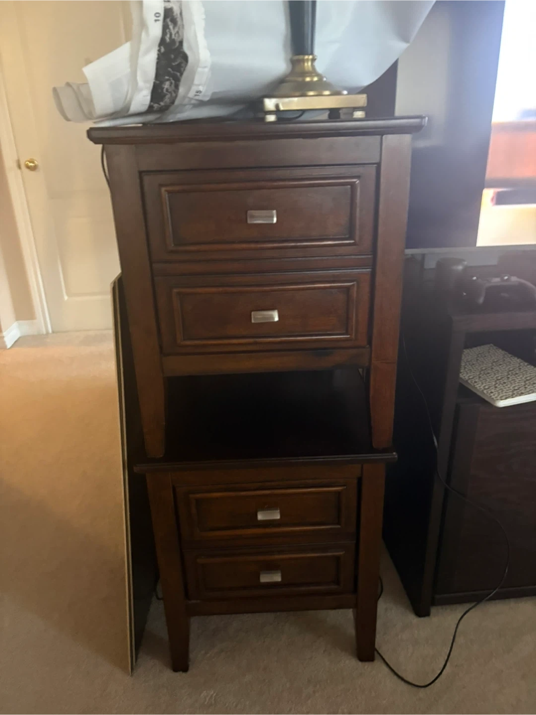 Selling a lovely brown wooden nightstand! It features drawers for storage and a classic design that would fit well in any bedroom. It's in good condition and ready for a new home