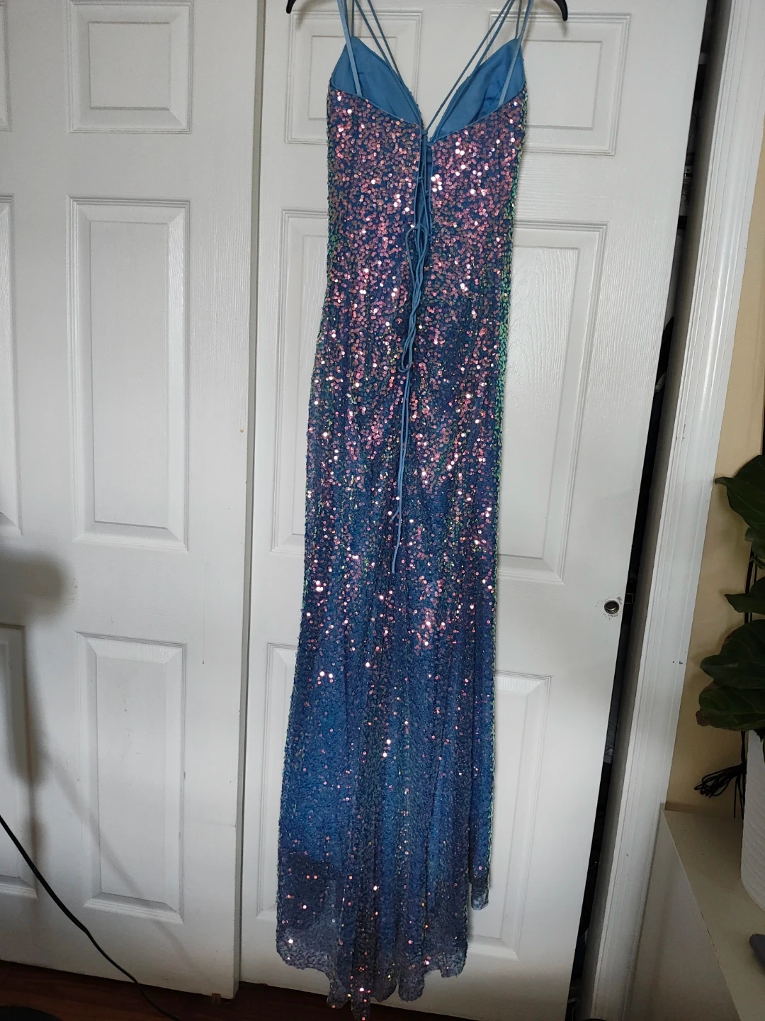 Beautiful sequin formal dress! It's a stunning blue and pink color and features a stylish slit. Perfect for a special occasion! Open to offers :)