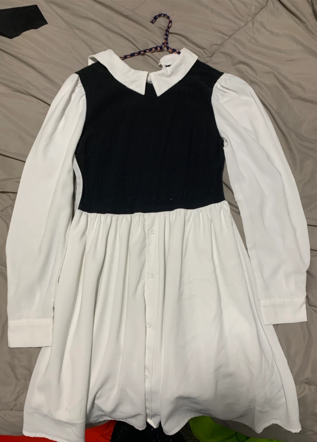 Cute black and white dress! It features a black bodice and a white skirt with button detailing. Perfect for a casual or dressed-up look. Used it for a choir performance but haven’t used it since.