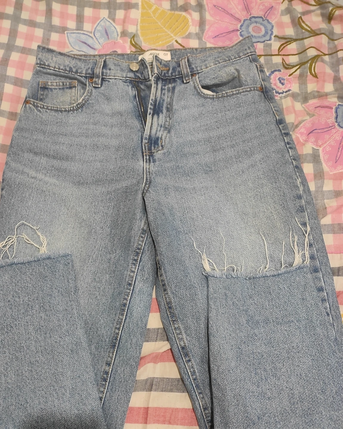 Selling a pair of light wash jeans. They have some distressed detailing, adding a bit of edge to your look! Great for casual wear or dressing up with a nice top
