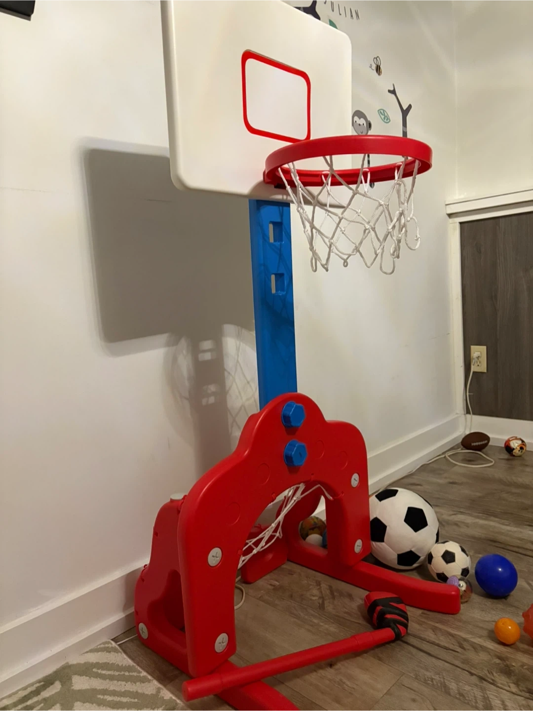 This basketball hoop set is perfect for little ones who are just starting to learn the game! It's in great condition and ready for a new home. Comes with a mini hockey stick and some balls for extra fun!