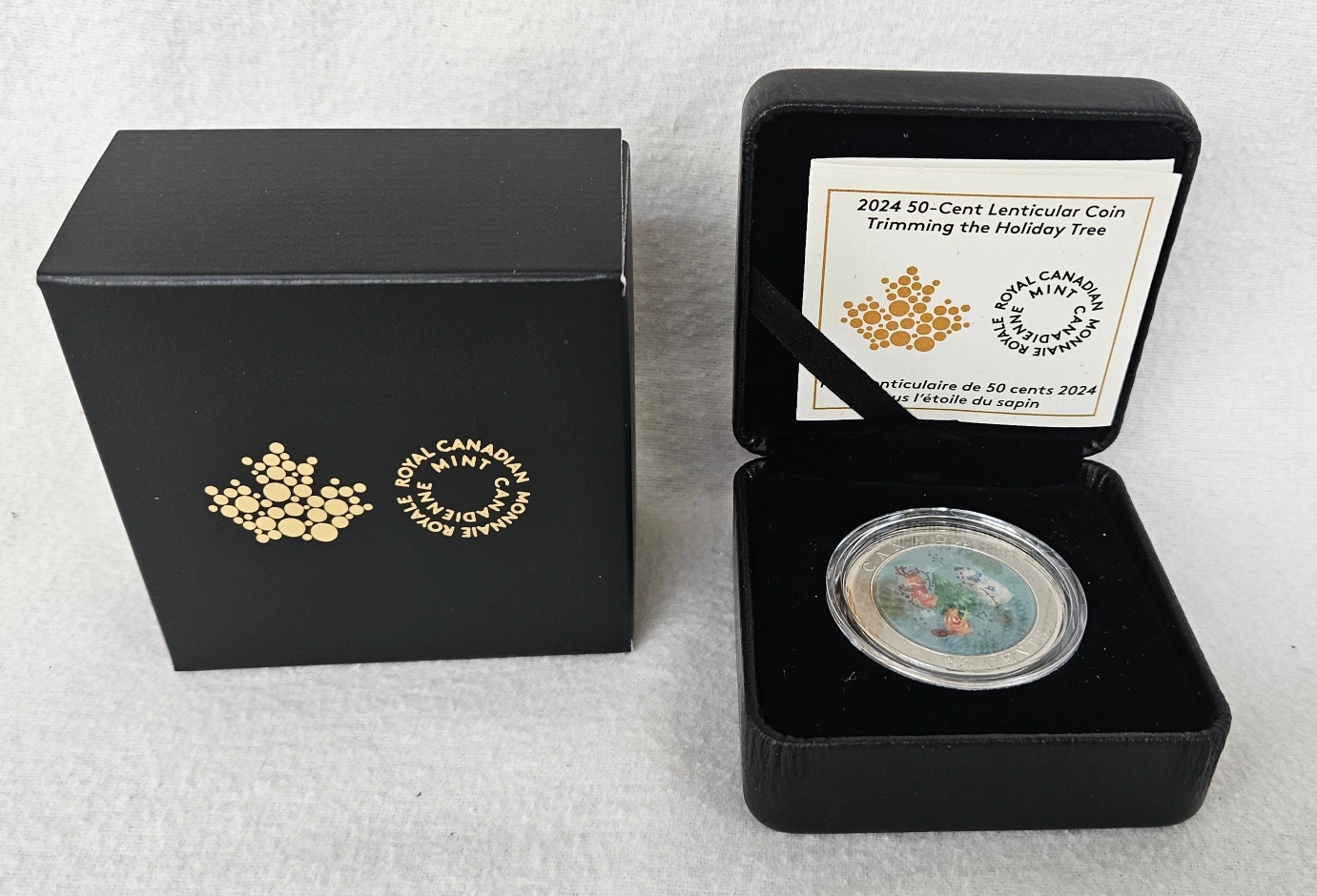 1000+New Trimming The Holiday Tree Coin 2024 Lenticular Technology Mint This Trimming The Holiday Tree Coin 2024 is new and it’s in mint cond. Tip the coin to see the winter scene shift from daytime to evening. The effect is made possible by lenticular technology, which provides a seamless transition between two different interlaced images the image you see depends on your viewing angle. SPECIFICATIONS Product Number 247866 Mintage 30,000 Composition Nickel-plated Steel Weight 12.3 g Diameter 35 mm Edge Plain Face Value 50 cents Finish Specimen Packaging Black clamshell with black beauty box Artist Alisha Giroux (reverse), Steven Rosati (obverse)