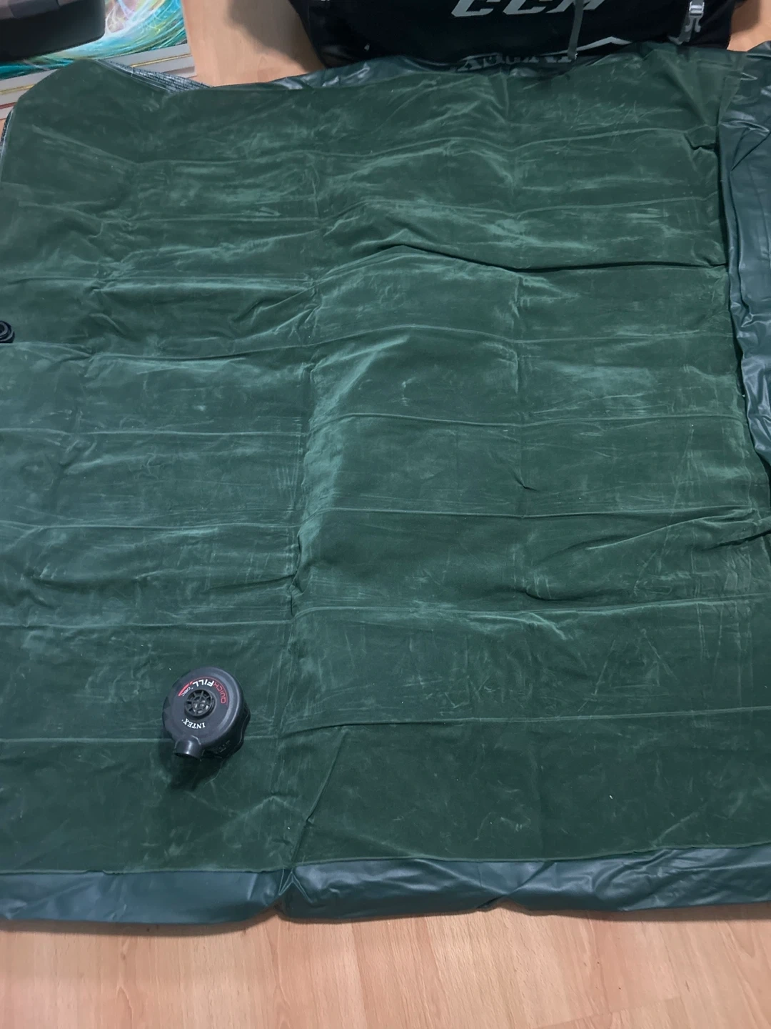 Here's a green Intex air mattress! It's in good condition and ready for a new home. Queen size does leak a bit but will be fine if patched