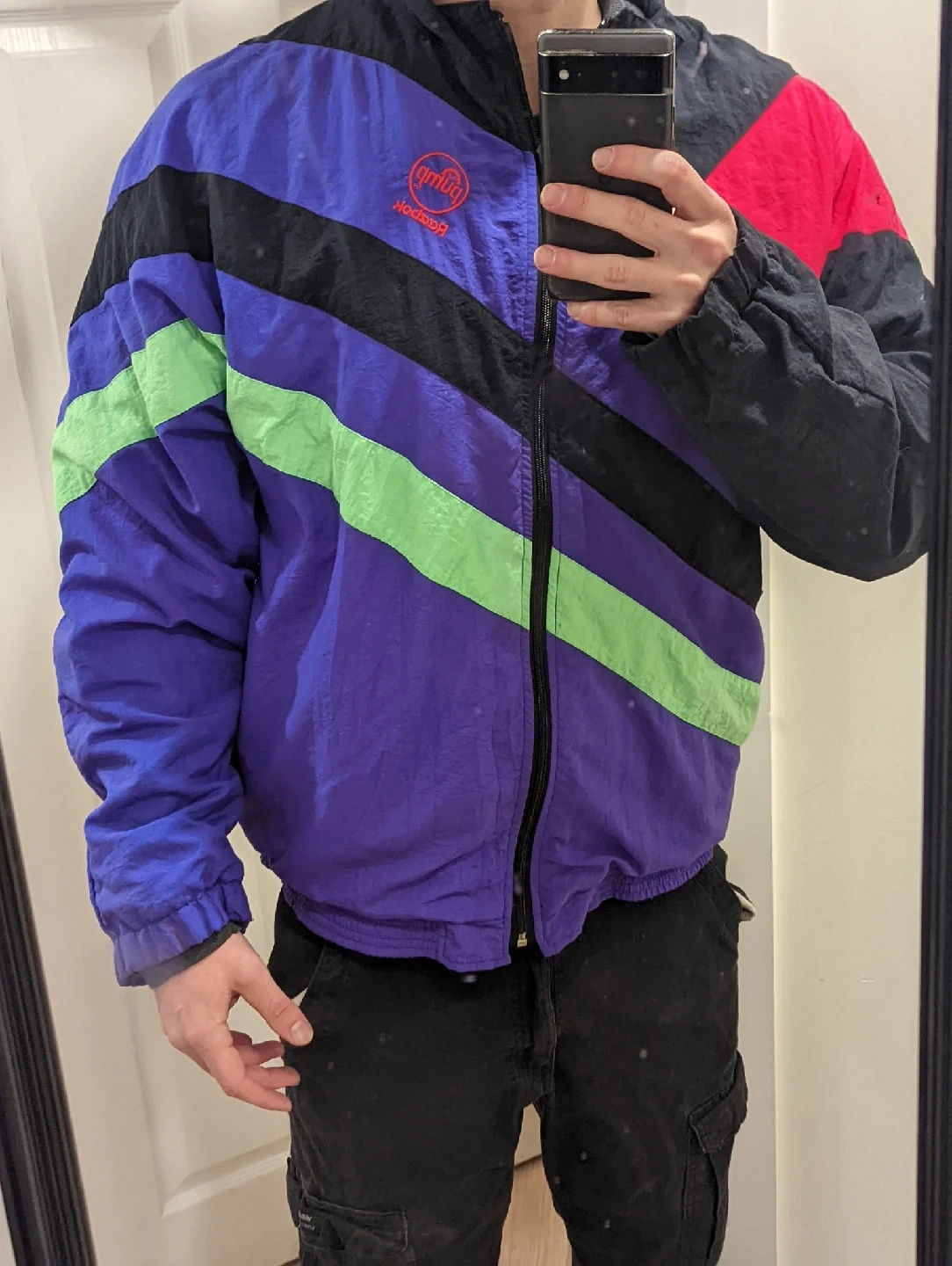 Cool Reebok The Pump jacket with a unique colour block design! The jacket features a mix of purple, black, red, and green stripes. Great for adding a retro vibe to your wardrobe!