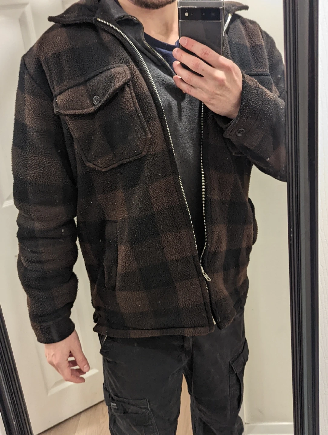 Selling a cozy fleece jacket with a brown and black plaid pattern. It features a full zip closure and handy pockets. Perfect for staying warm and stylish on chilly days! 🥕