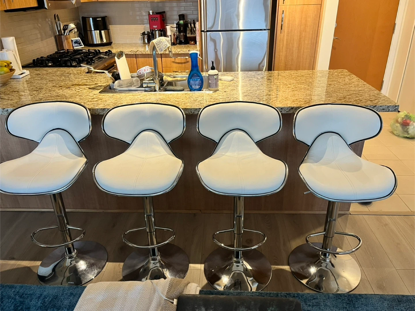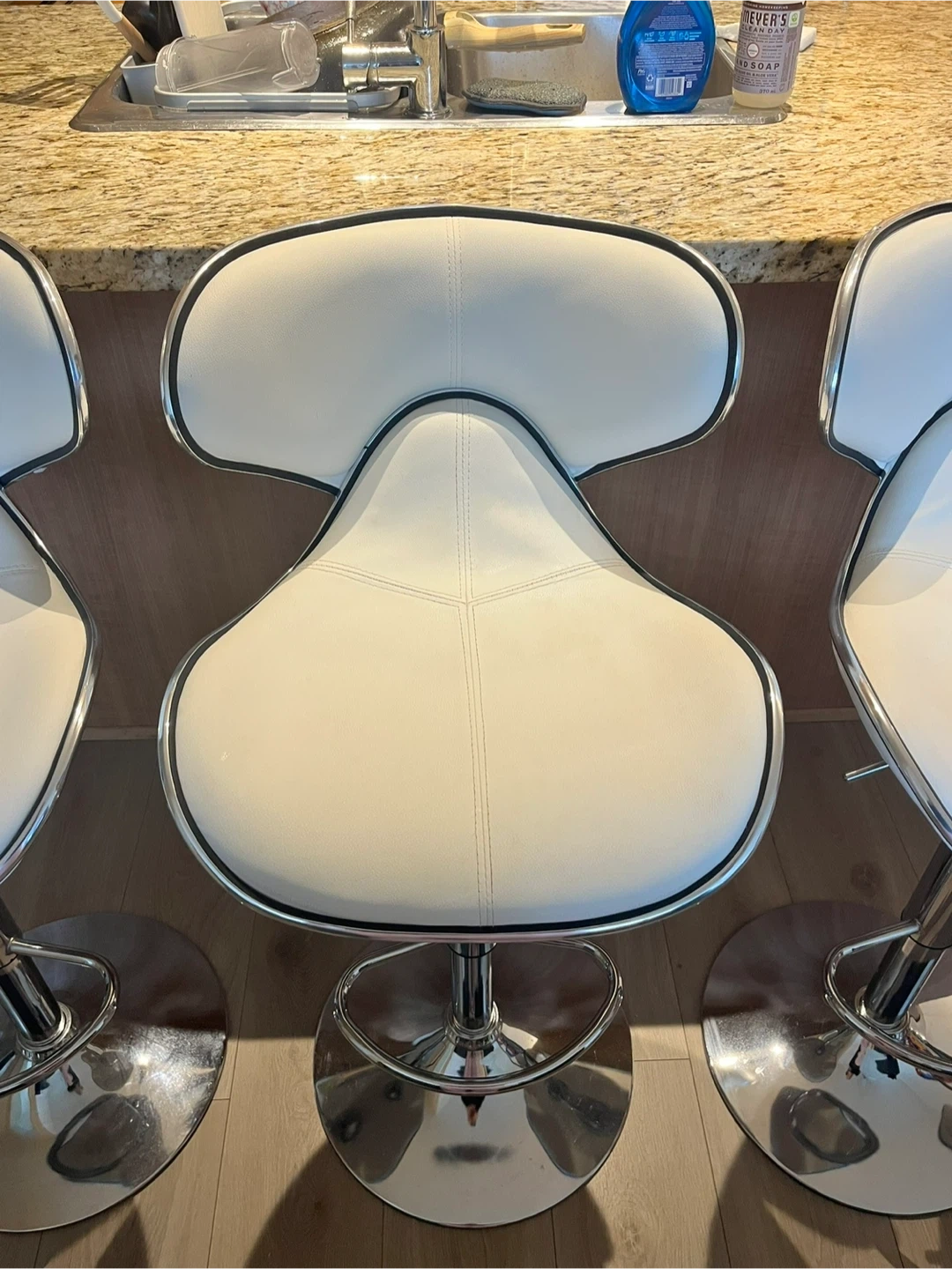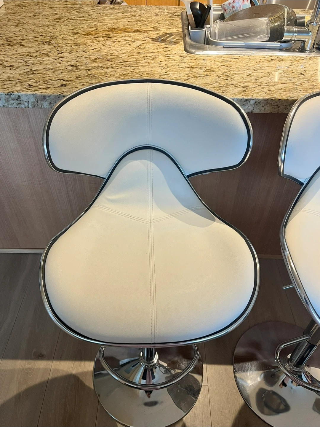 The barstools have an adjustable height and are very comfortable. The stools are in good condition - there are some faint markings on two of the chairs (they can be seen in the last two photos).