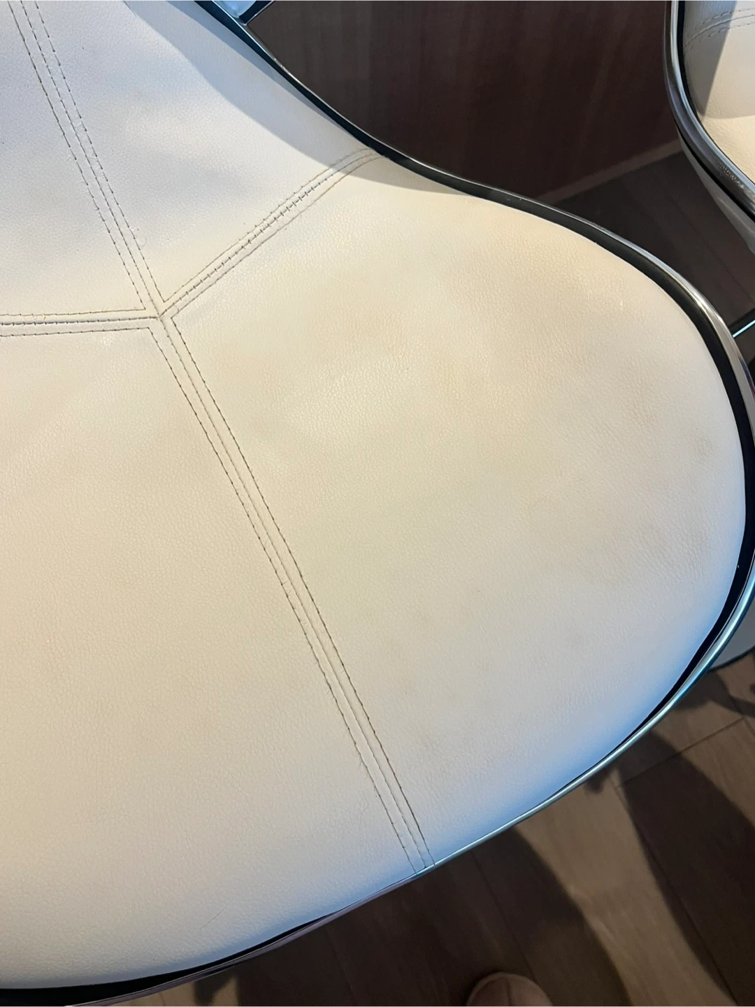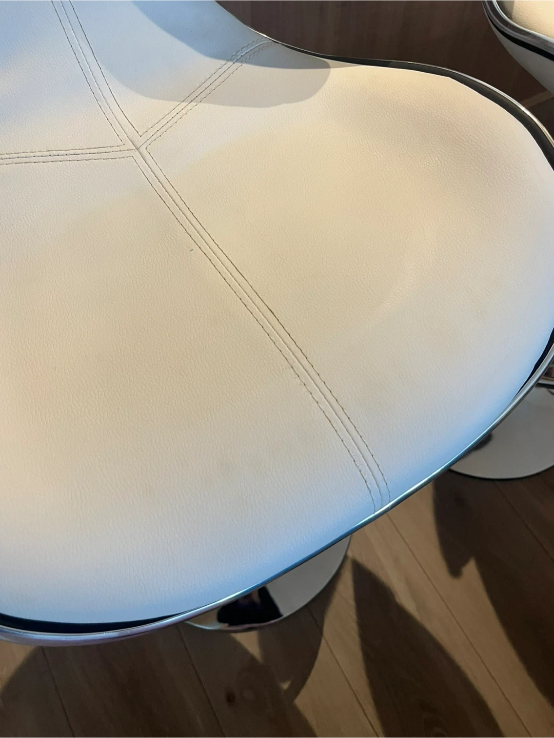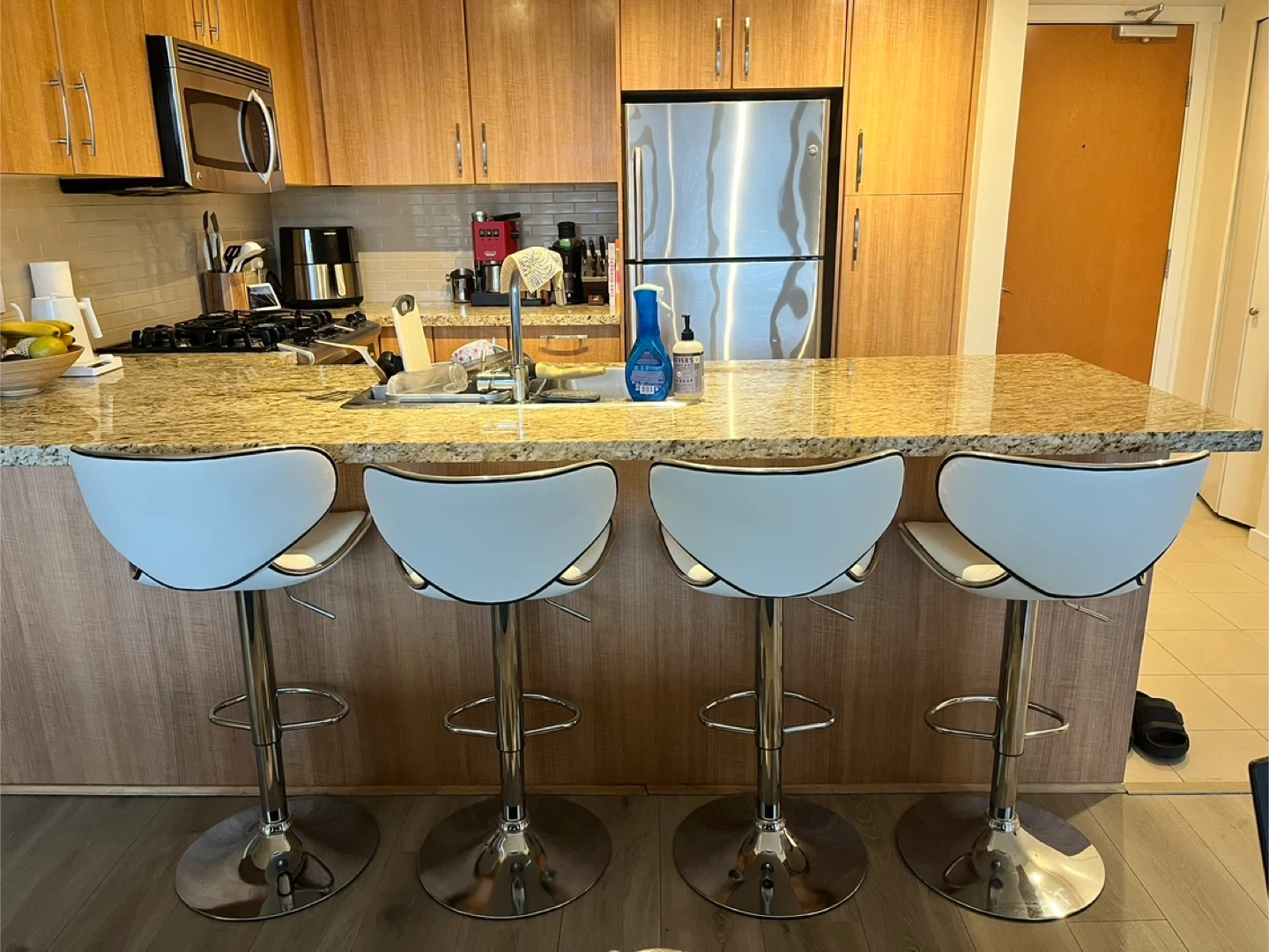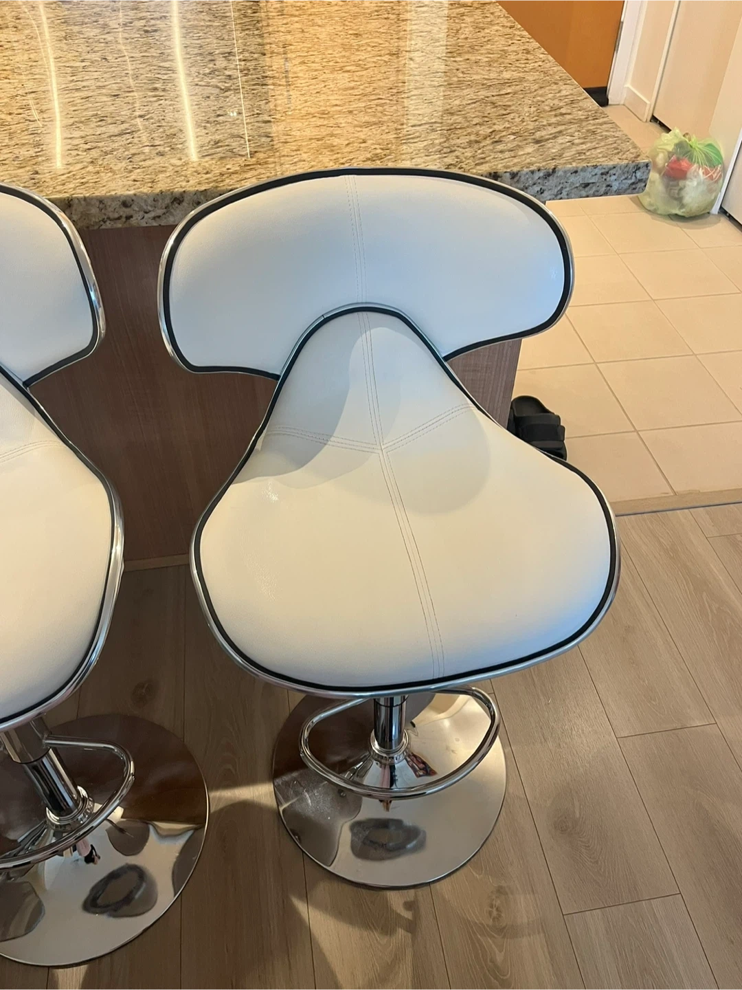 The barstools have an adjustable height and are very comfortable. The stools are in good condition - there are some faint markings on two of the chairs (they can be seen in the last two photos).