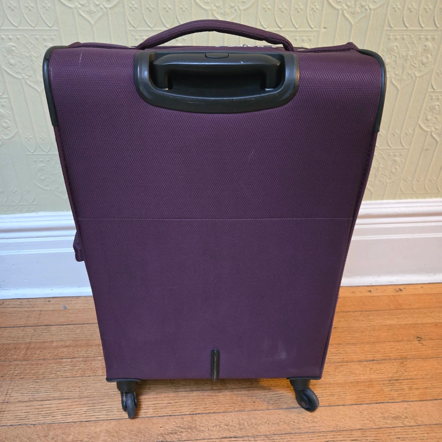 Selling a Swiss Gear suitcase (not carry-on size) in a lovely purple colour. It's in great condition and ready for your next trip! It has a retractable handle and wheels for easy transport. Plus has expandable capabilities and three zippered pockets for easy access of items.