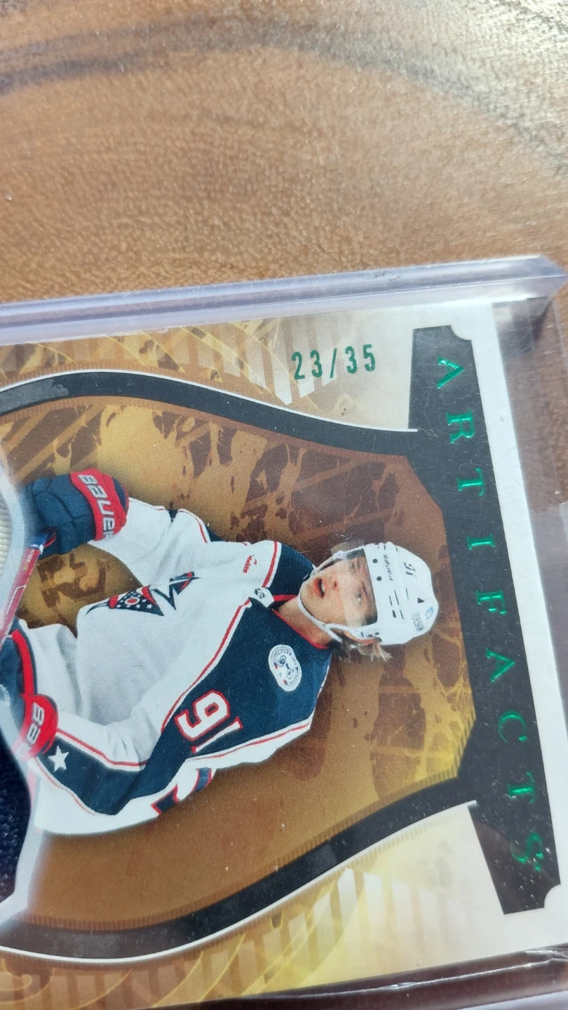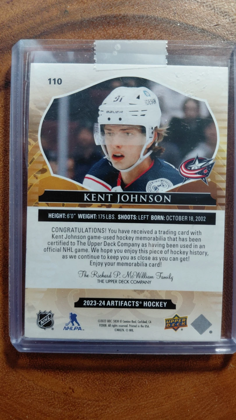 Selling a Kent Johnson Artifacts hockey card, numbered 23/35. It includes a piece of game-used hockey memorabilia. A great piece of NHL history to enjoy! 20/35