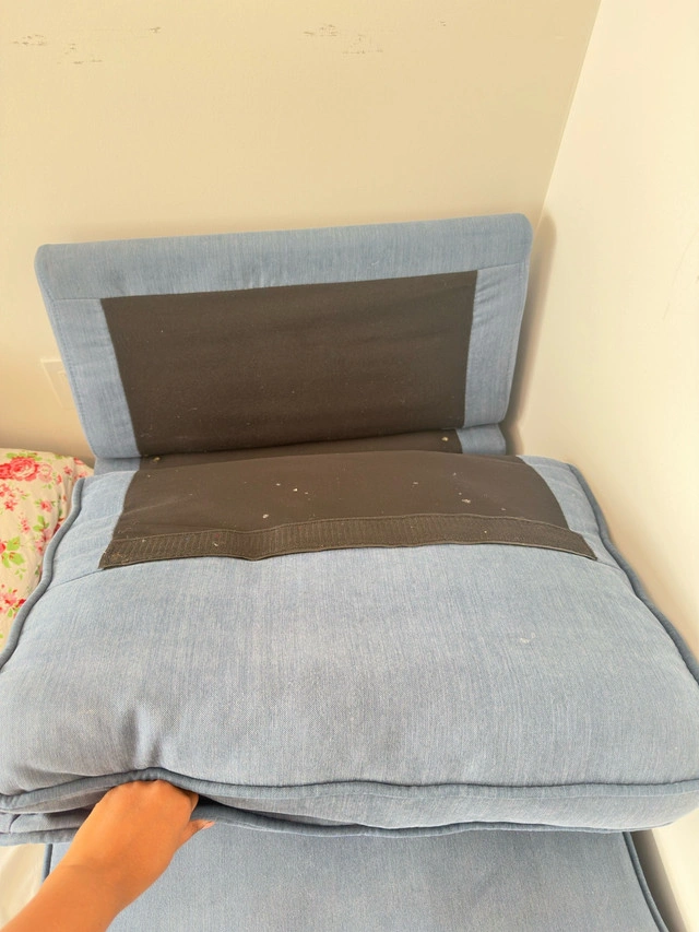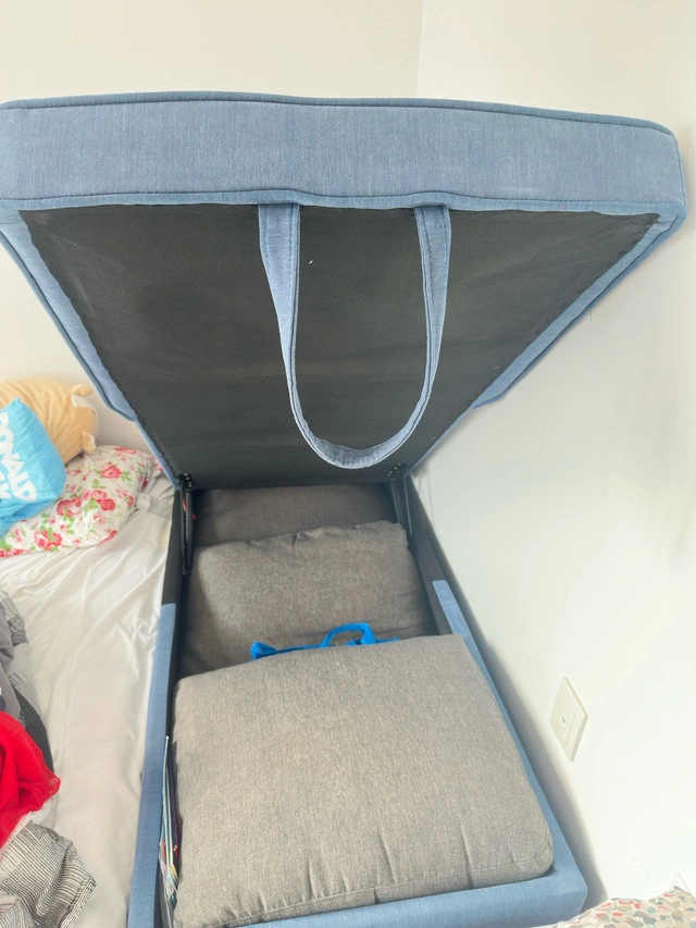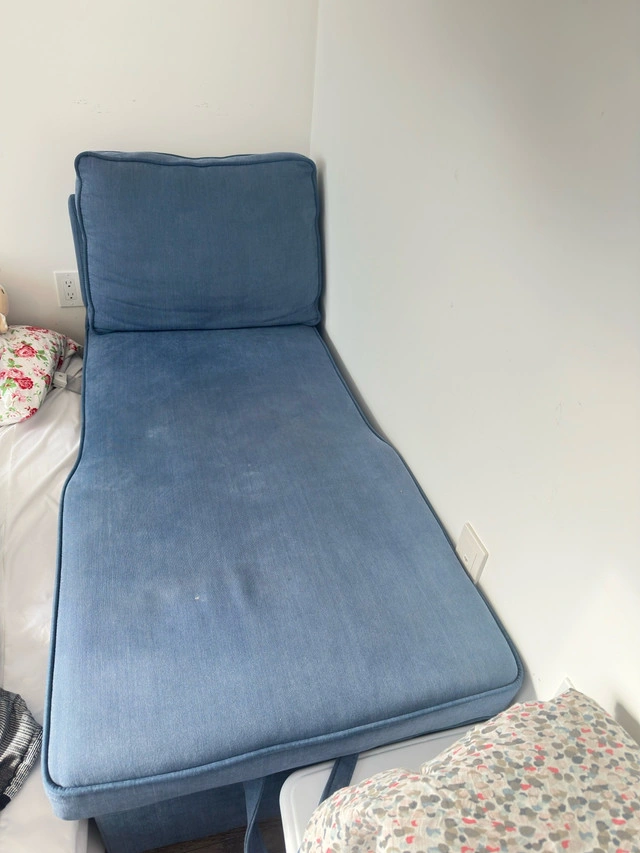 10Selling a stylish blue chaise lounge with built-in storage compartment — perfect for small spaces, bedrooms, or living rooms. ✅ Soft cushioned seat and backrest for relaxing or reading ✅ Hidden storage under the seat (great for blankets, pillows, or clothes) ✅ Sturdy wooden frame with durable fabric ✅ Compact and modern design Condition: Gently used, clean, and fully functional Colour: Denim Blue Pickup: Kitchener Price: CA $120 (OBO)