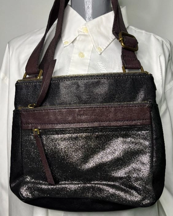23One of the most popular designers of purses and bags for women brings you this beautiful and stylish Fossil Corey Crossbody Purse. The coloring is stunning with a hint of purple hue on a black background that is accented with a panel of glitter material that makes this Fossil purse shine! An excellent everyday purse, the versatility, style and look makes it usable for more formal or social occasions like a dinner out on the town, a wedding or formal gathering. The many storage options allows you to compartmentalize your necessities while readily accessing what you need. This Fossil Corey Crossbody Purse is an all around versatile bag to add to your wardrobe. Local pickup is in Etobicoke near Islington and The Westway. We offer shipping and local delivery for this item. Please send a message about availability and cost associated with these respective services.