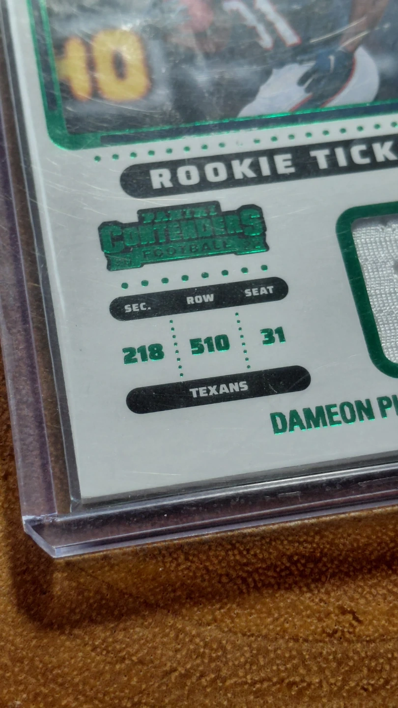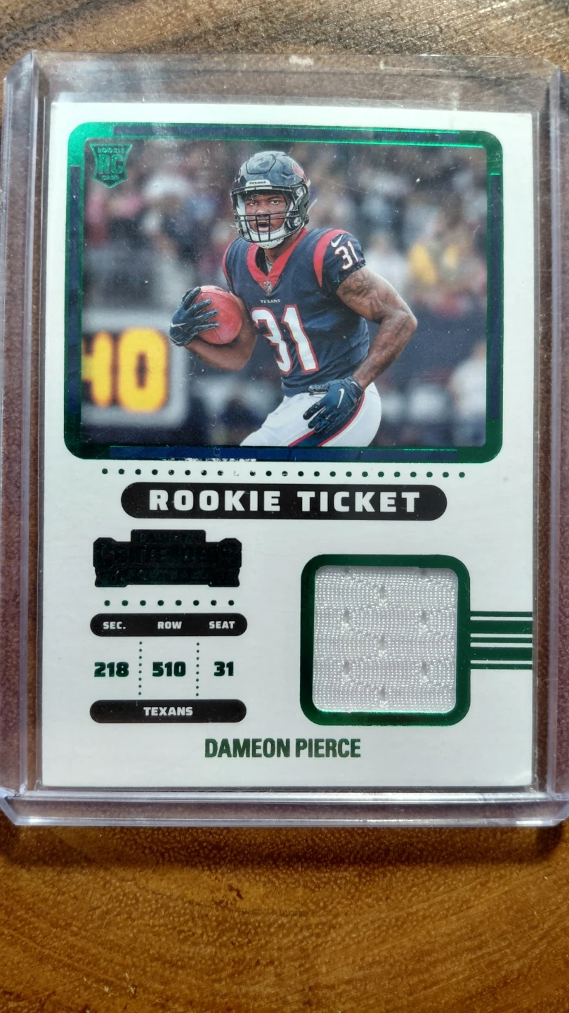Selling a Dameon Pierce Rookie Ticket football card. The card features a piece of authentic memorabilia. It's a 2022 Panini Contenders Football card featuring the Texans running back.