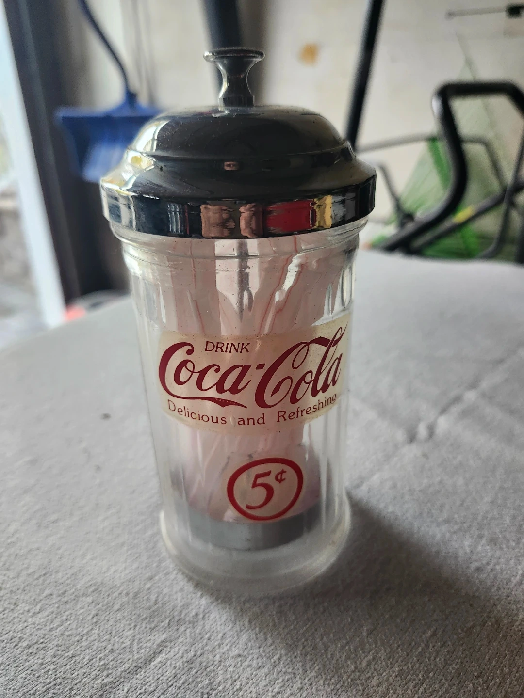 Selling a vintage Coca-Cola straw dispenser! It's in great shape and would be a super cute addition to any kitchen or collection. The glass jar has the classic Coca-Cola logo and a 5¢ price marking. Perfect for adding a touch of retro charm to your home! 6.5 inches tall