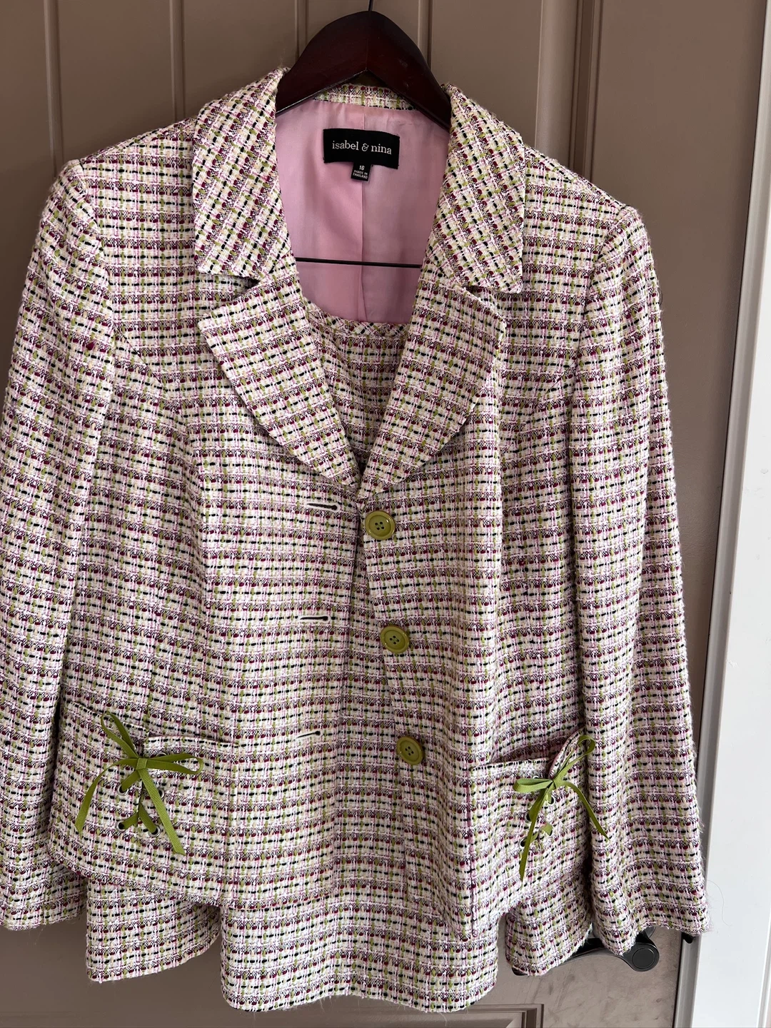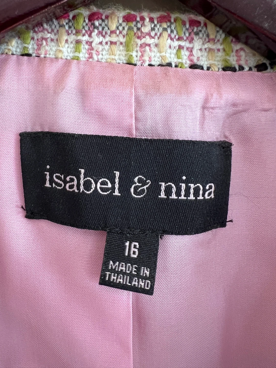 This is a lovely Isabel & Nina tweed suit in a size 16. The outer material is 100% acrylic and the lining is 100% acetate. The suit features a unique tweed pattern with hints of pink, green, and black. It's a stylish and comfortable outfit! But fits more like at 12