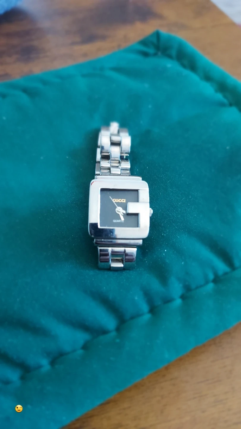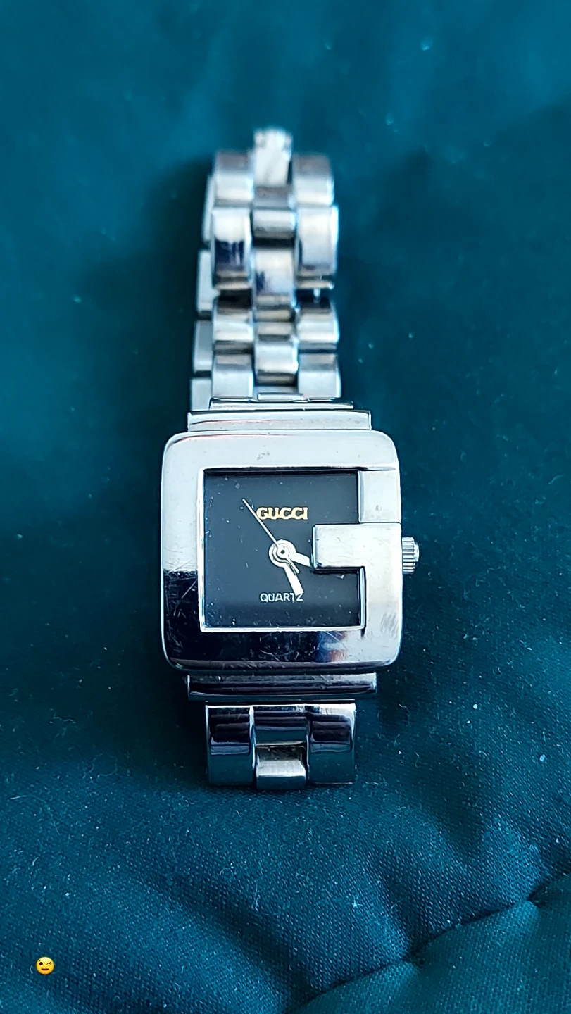 This is a Gucci quartz wristwatch with a silver-tone metal band and a black face. It's a stylish accessory for everyday wear. The watch features a classic G-shaped detail on the bezel.