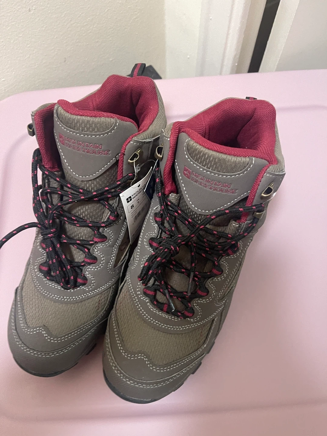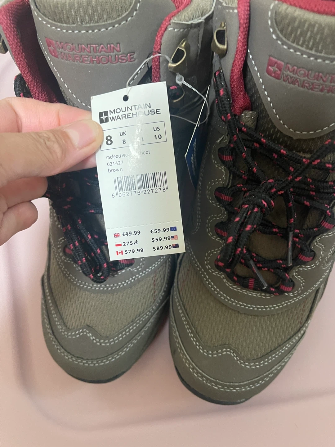 Here are Mountain Warehouse McLeod walking boots in US size 10. They are brown and look like they're in great condition. The tag shows they were originally $79.99 CAD
