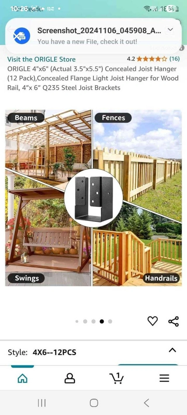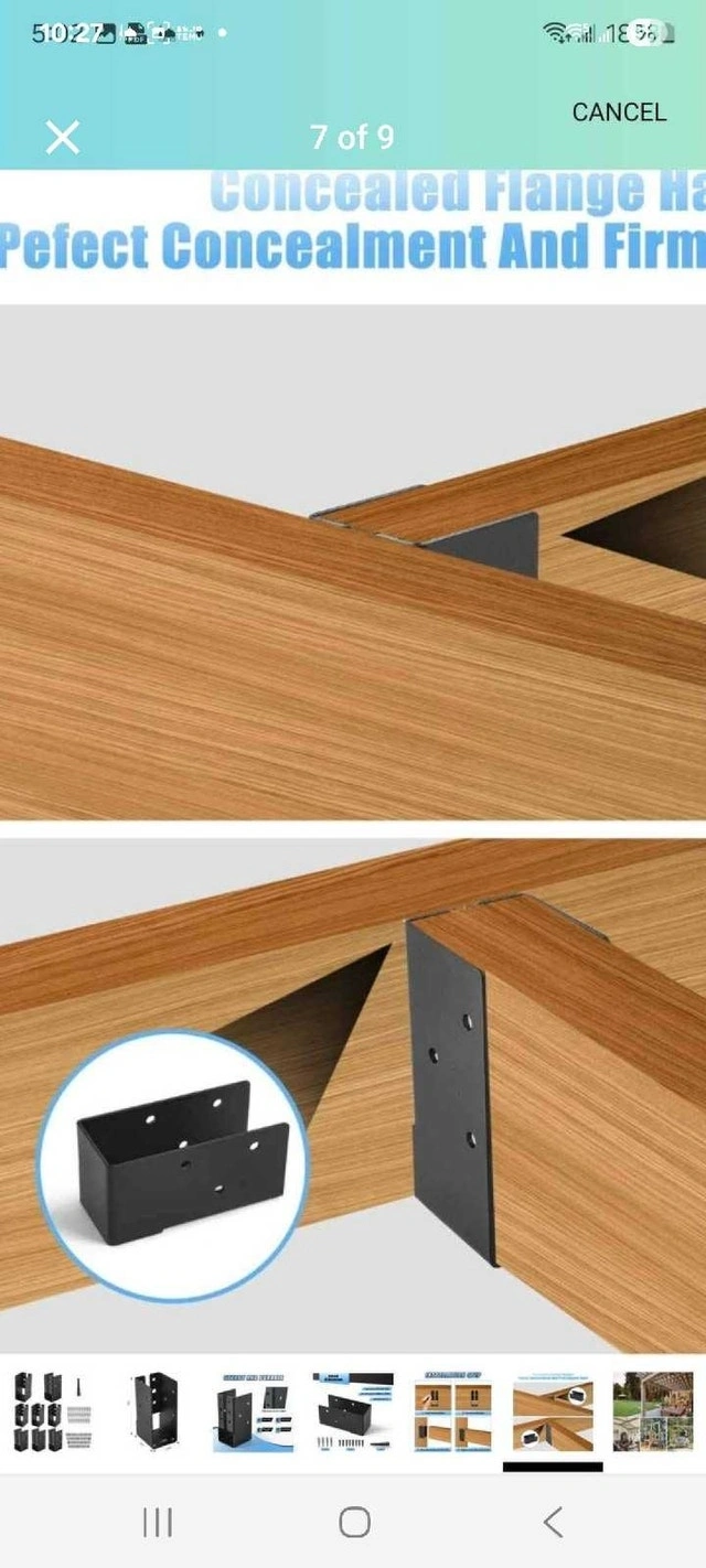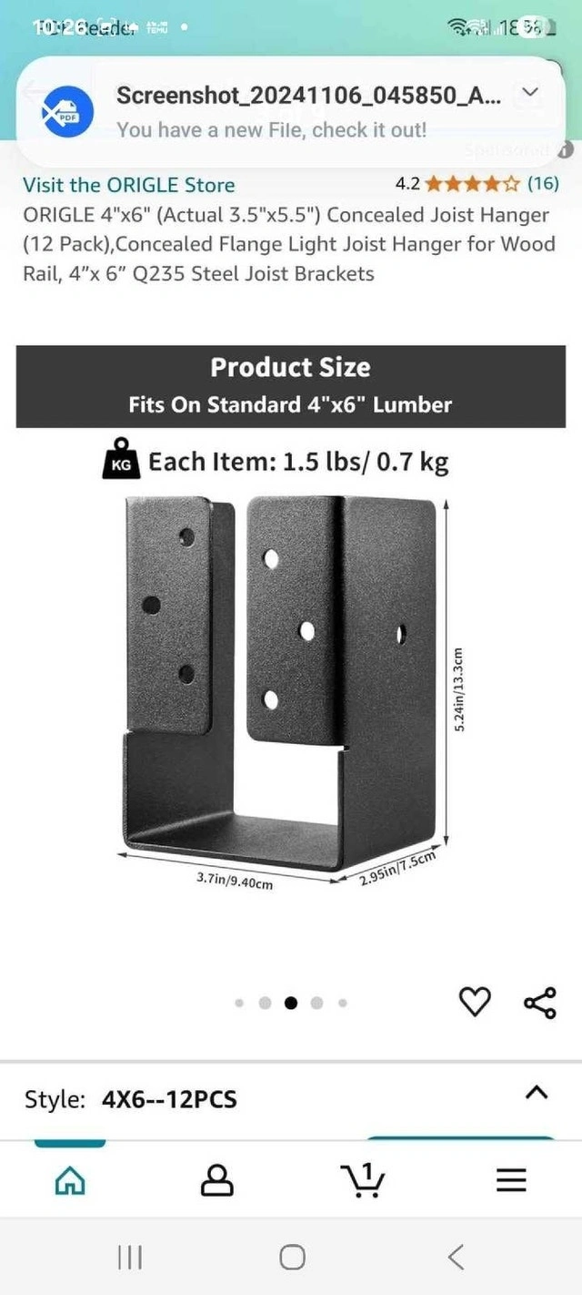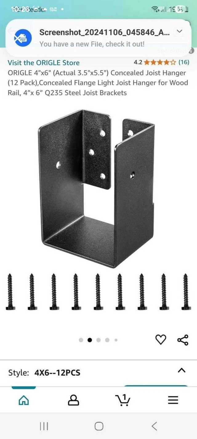 Selling a set of twelve Origle 4x6 concealed joist hangers, perfect for wood rail construction projects. Each bracket measures 3.5"x5.5" and is made of sturdy and durable Q235 steel. They are new in their original packaging. These will help you create a professional finish. Fits standard 4"x6" lumber. Each hanger weighs 1.5 lbs / 0.7 kg. Still available!
