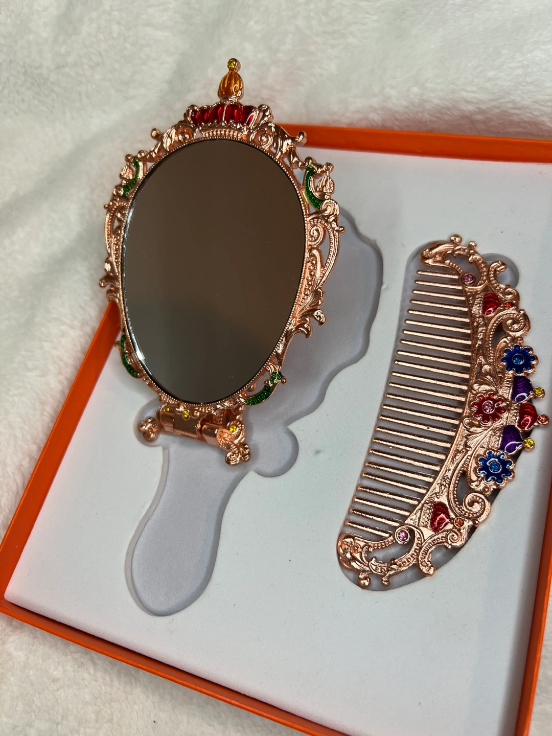 Selling a beautiful ornate mirror and comb set. It features a rose gold finish with colourful jewel accents. The set comes in its original box, perfect for gifting or adding a touch of elegance to your vanity!