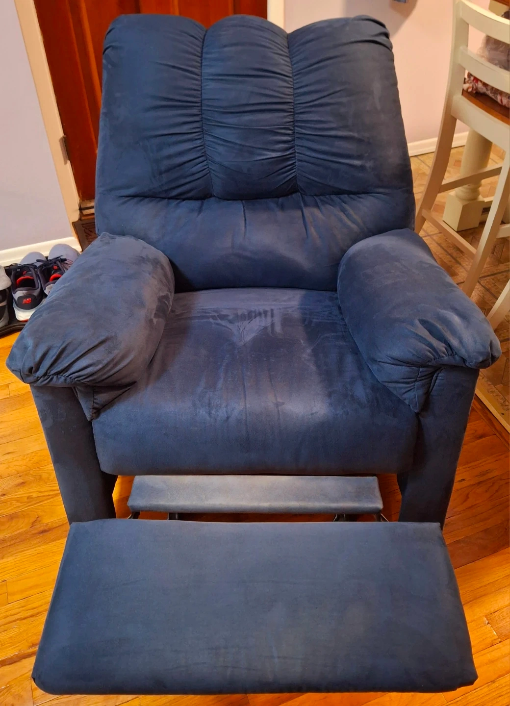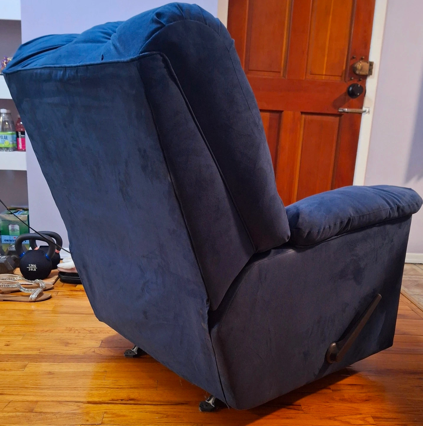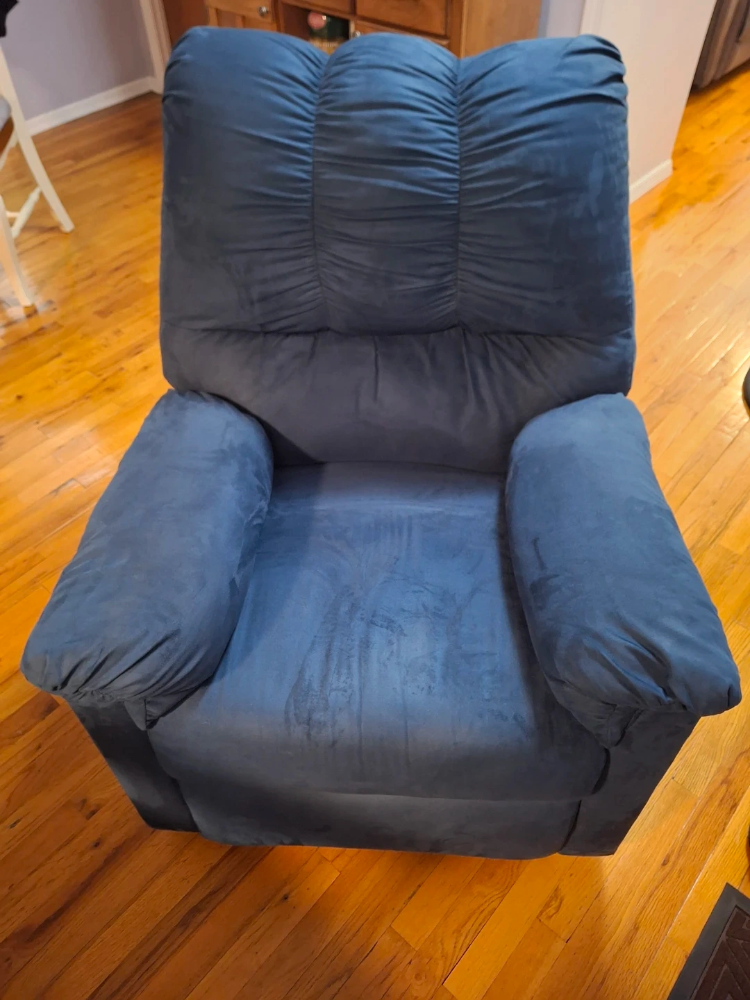 Comfortable blue recliner chair! It's in excellent to good condition and ready for a new home. Perfect for relaxing after a long day