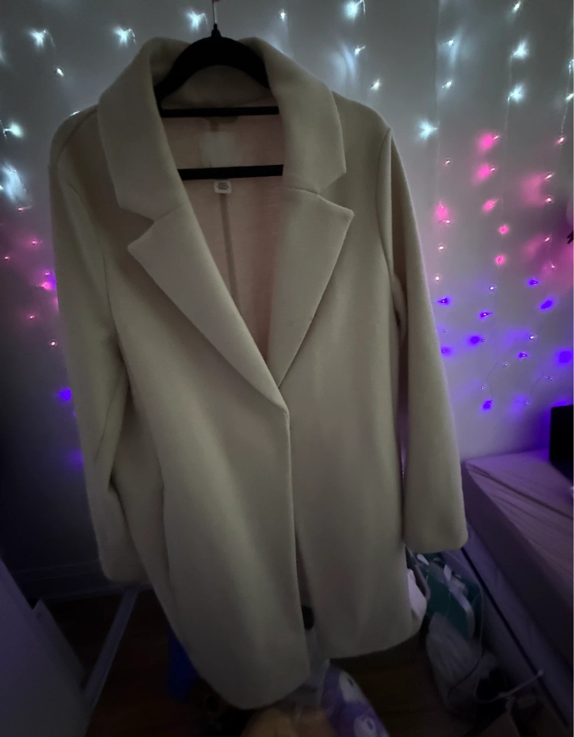 Selling a beige coat from H&M. It's in great condition and perfect for layering during the cooler months. The neutral colour makes it easy to pair with any outfit!