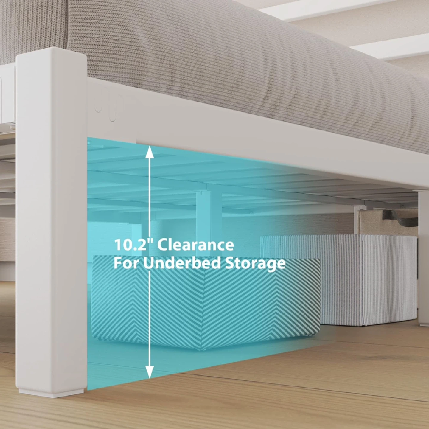 Under Bed Storage: Experience the convenience of 12 inches of space under the bed to make the most of your bedroom space. Utilizing this extra space to place storage bins to store your extra bedding, seasonal clothing or other items provides an ideal storage solution