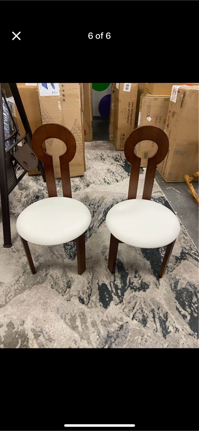 137Wayfare Price $ Selling a set of two dining chairs! They feature a unique design with a circular cutout in the backrest and comfy white cushions. The frames are made of a dark brown wood. Great for adding a touch of modern style to your dining space New Set of 2 Brown Wood Dining Chairs $75 each