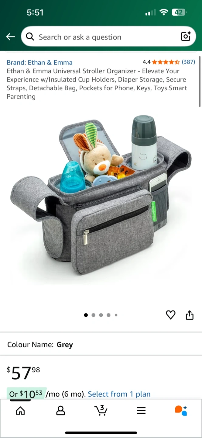 1000+Elevate your experience with this Ethan & Emma universal stroller organizer! It features insulated cup holders, diaper storage, secure straps, a detachable bag, and pockets for your phone, keys, and toys. It's great for smart parenting! Sells for $57.98 Brand new unused in original packaging in Giftable condition