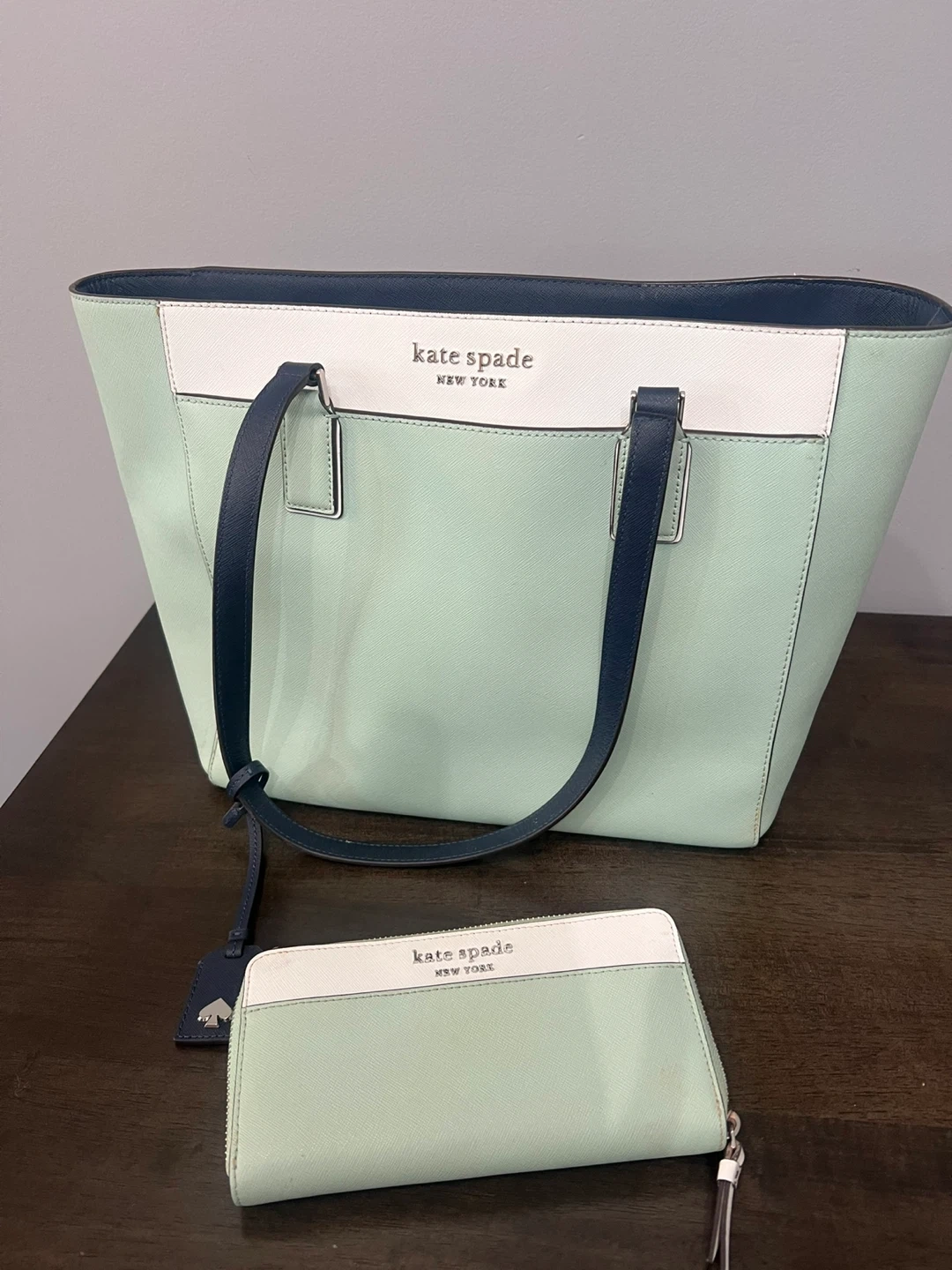 Selling a lovely Kate Spade tote bag and matching wallet set! The set features a beautiful light green colour with navy blue accents. Perfect for everyday use or a stylish addition to your collection
