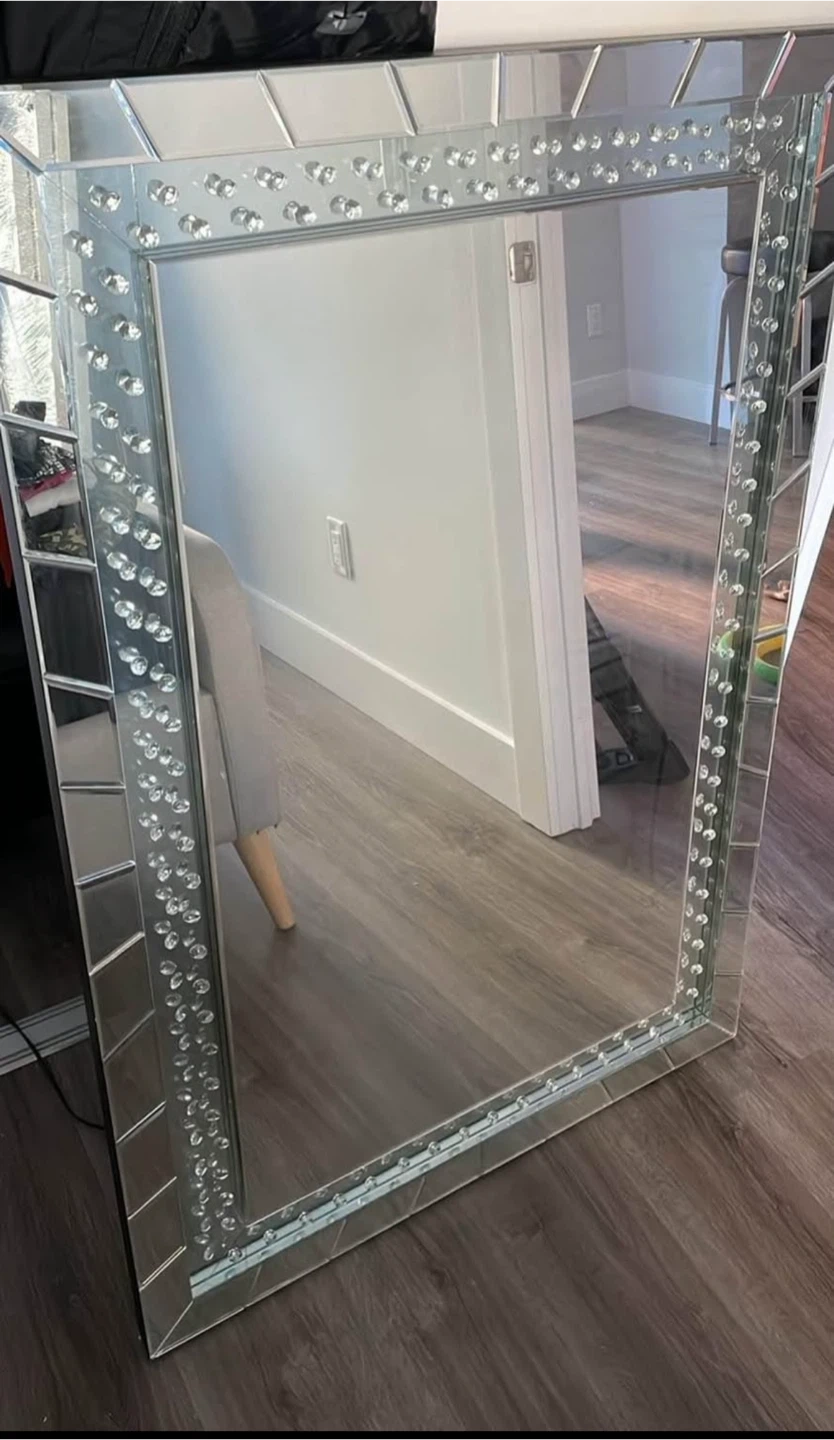 Selling a lovely decor mirror! It features crystal accents around the frame, adding a touch of elegance to any room. It's in great condition and ready to brighten up your space