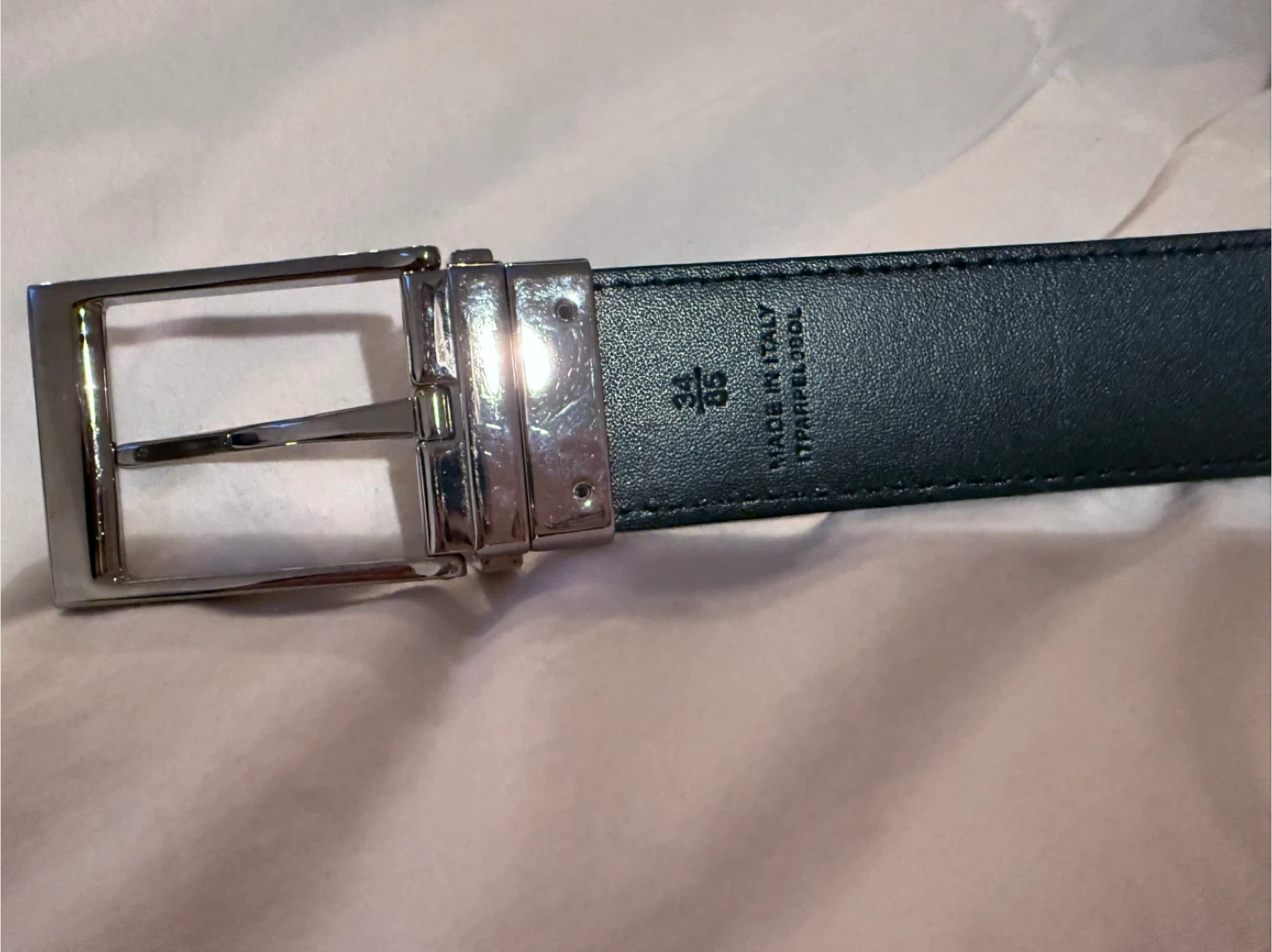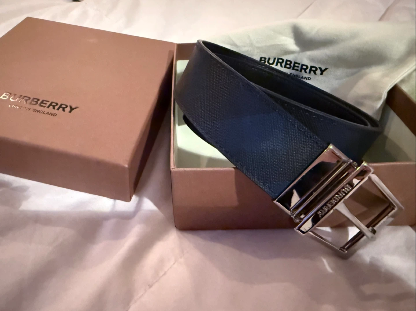 250Selling a Reversible Burberry Belt , one side is blue Burberry plaid print and the other is plain black leather belt. It's in great condition and comes with its original box and dust bag. The belt is a size 34/85 and features a stylish buckle design. A classic accessory to elevate your look! I purchased this for my son a couple years ago, but it was a little small and I forgot to return, so it has just been sitting in his drawer