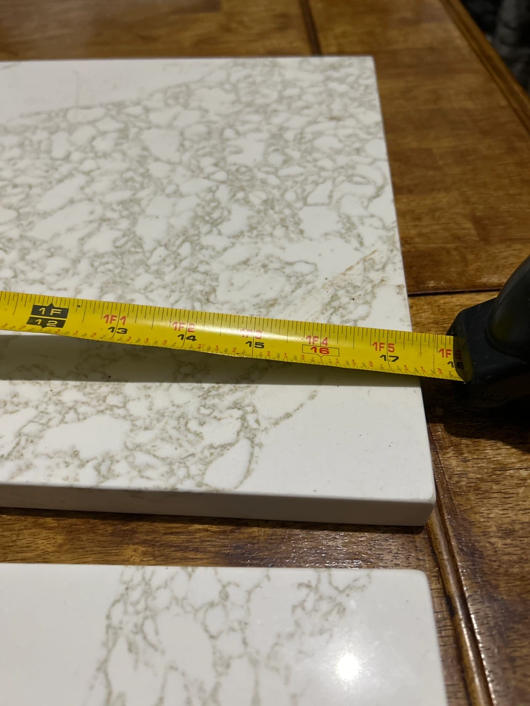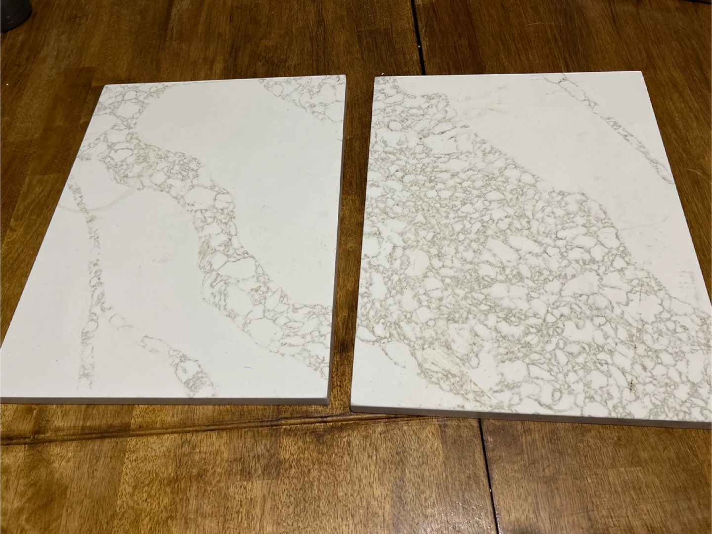 Selling two pieces of quartz countertop with a beautiful white marble pattern. Each piece is approximately 12 inches by 16 inches. They're perfect for smaller projects or as accents in your home!