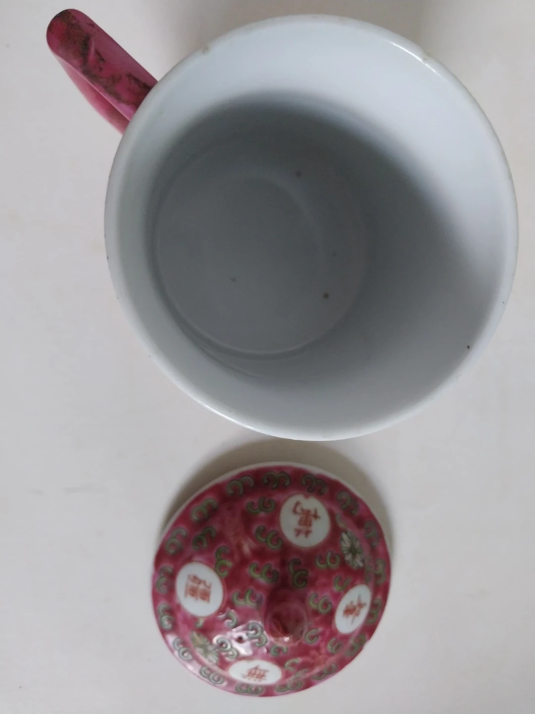 Selling a vintage Chinese tea cup with a lid. It features a beautiful and intricate design with traditional Chinese characters and floral patterns. It's in great condition and would make a lovely addition to any collection or a unique piece for your tea time