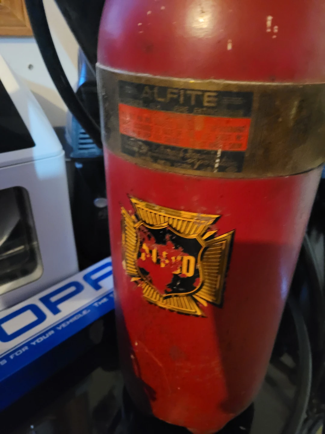 Selling a vintage Alfite fire extinguisher. It's a cool piece with a classic look, perfect for adding a bit of retro style to your space. It shows some signs of wear, which adds to its vintage charm!