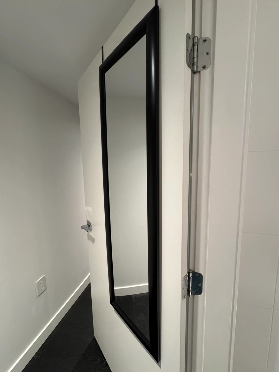 Here's a sleek black over-the-door mirror that's perfect for adding a touch of style and functionality to any room. It's in great condition and super easy to install—just hang it over the door!