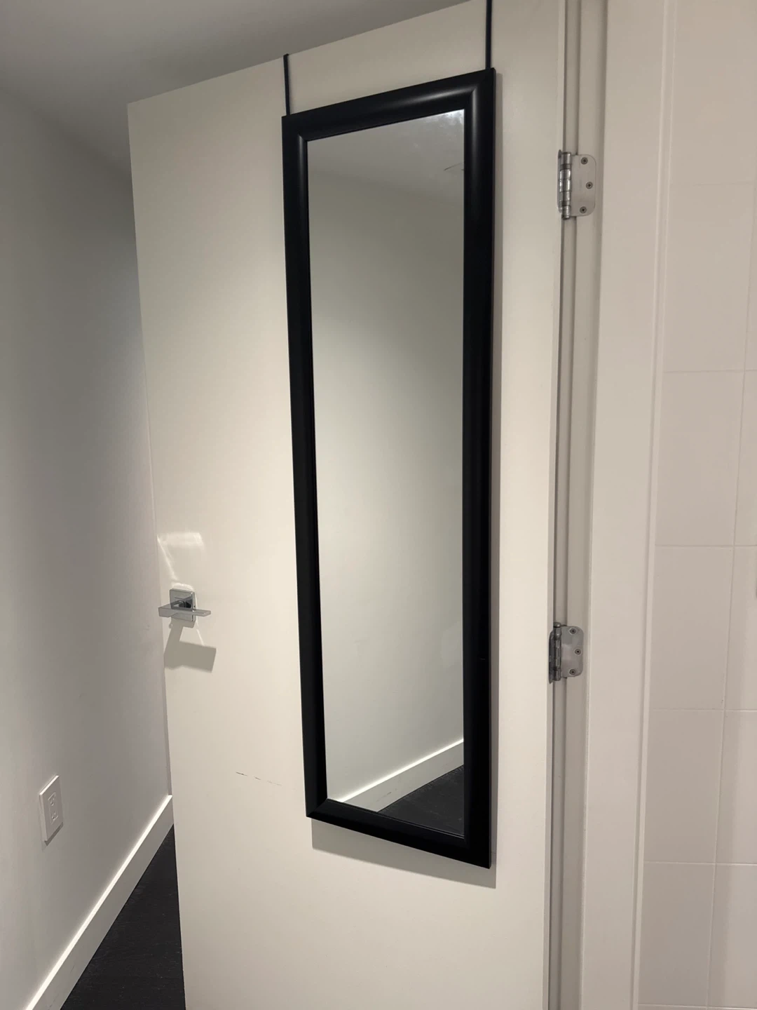 Here's a sleek black over-the-door mirror that's perfect for adding a touch of style and functionality to any room. It's in great condition and super easy to install—just hang it over the door!