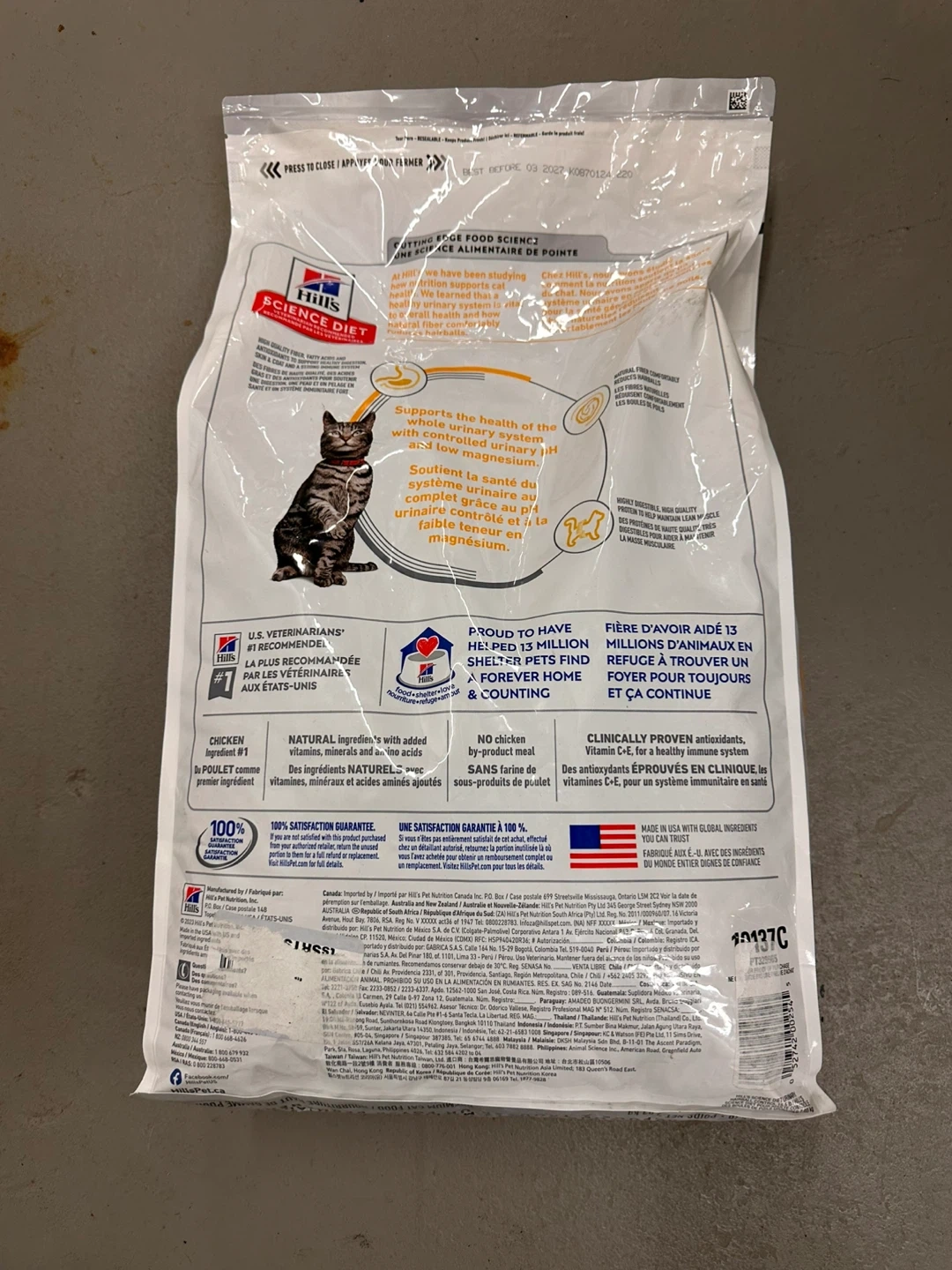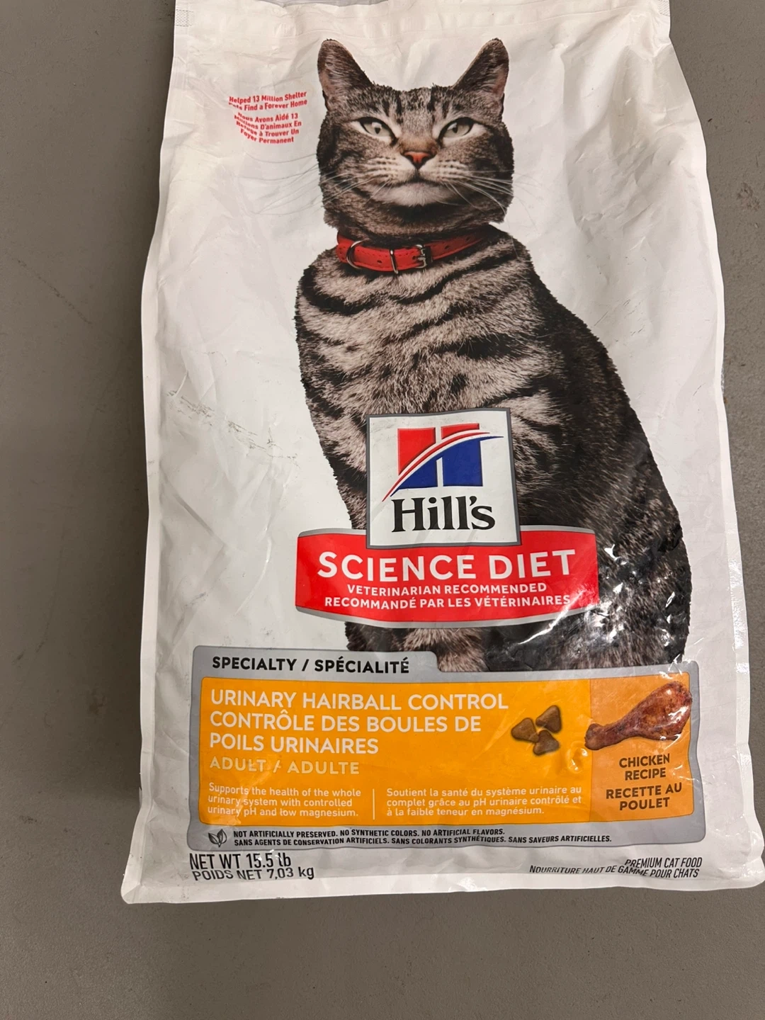 Selling a bag of Hill's Science Diet Urinary Hairball Control cat food for adult cats. The bag is 15.5 lb (7.03 kg). It supports the health of the whole urinary system with controlled urinary pH and low magnesium. Best before March 2027!