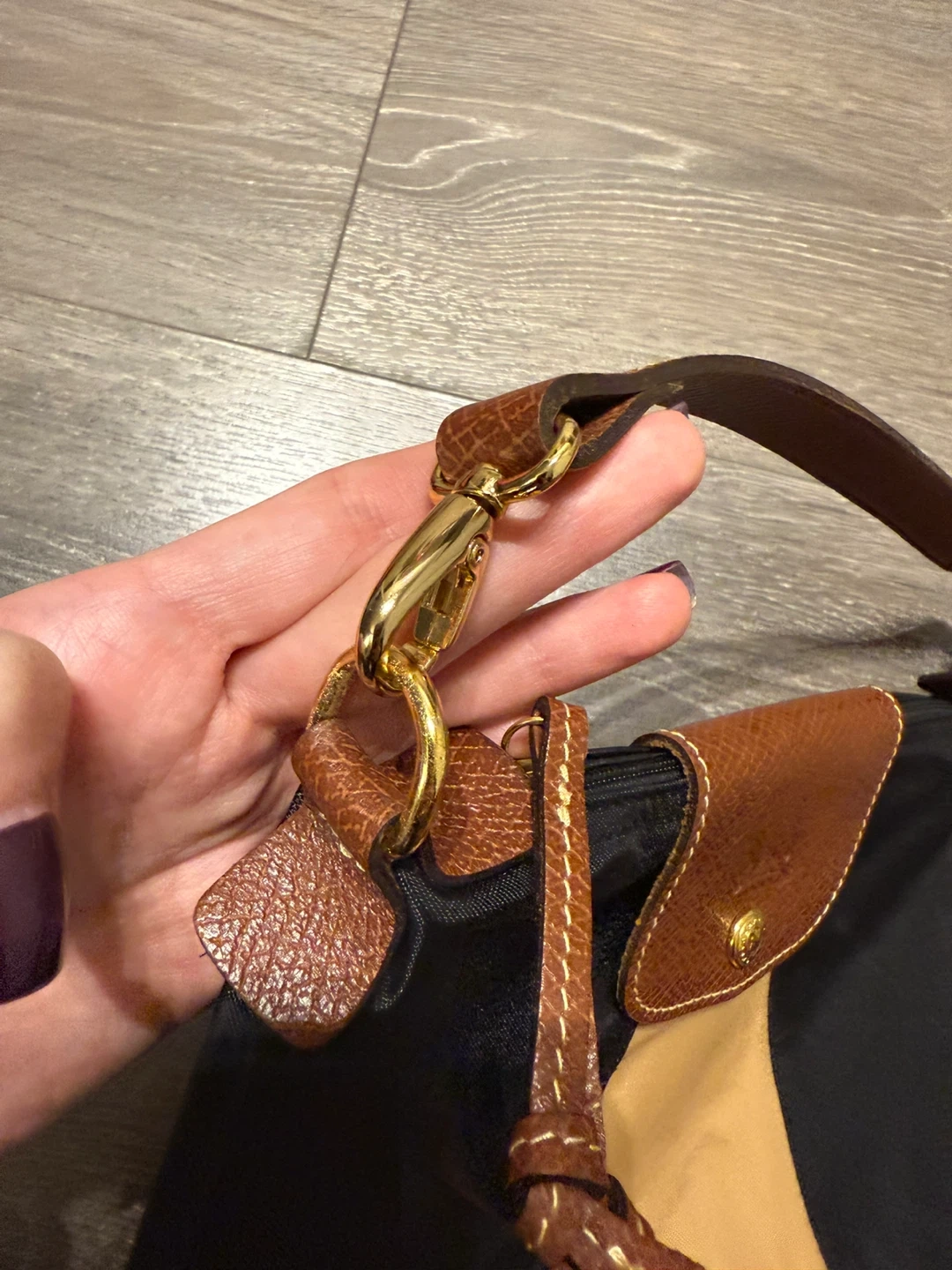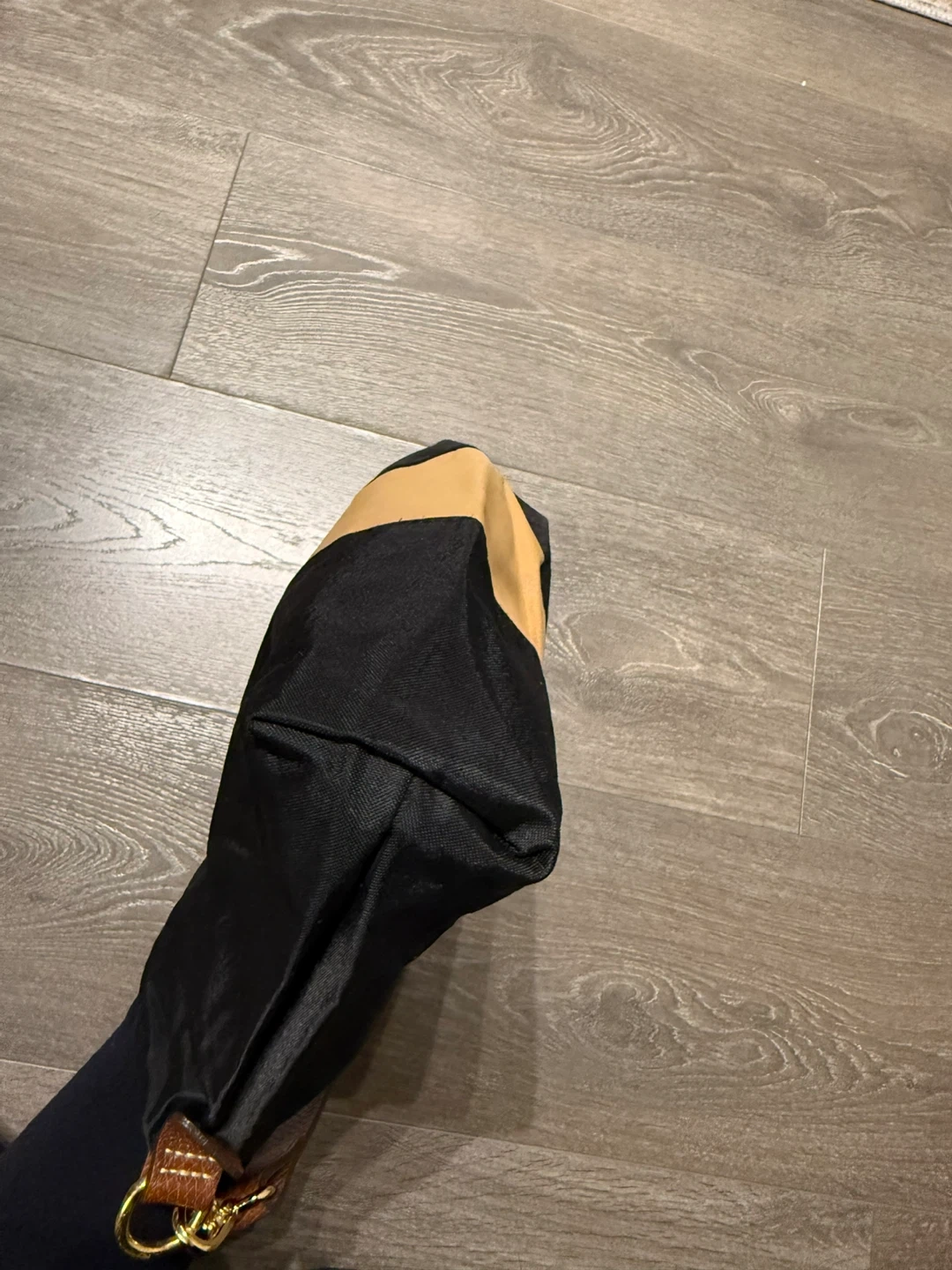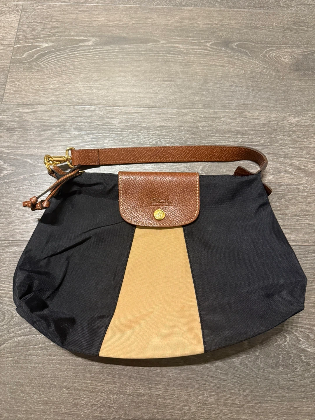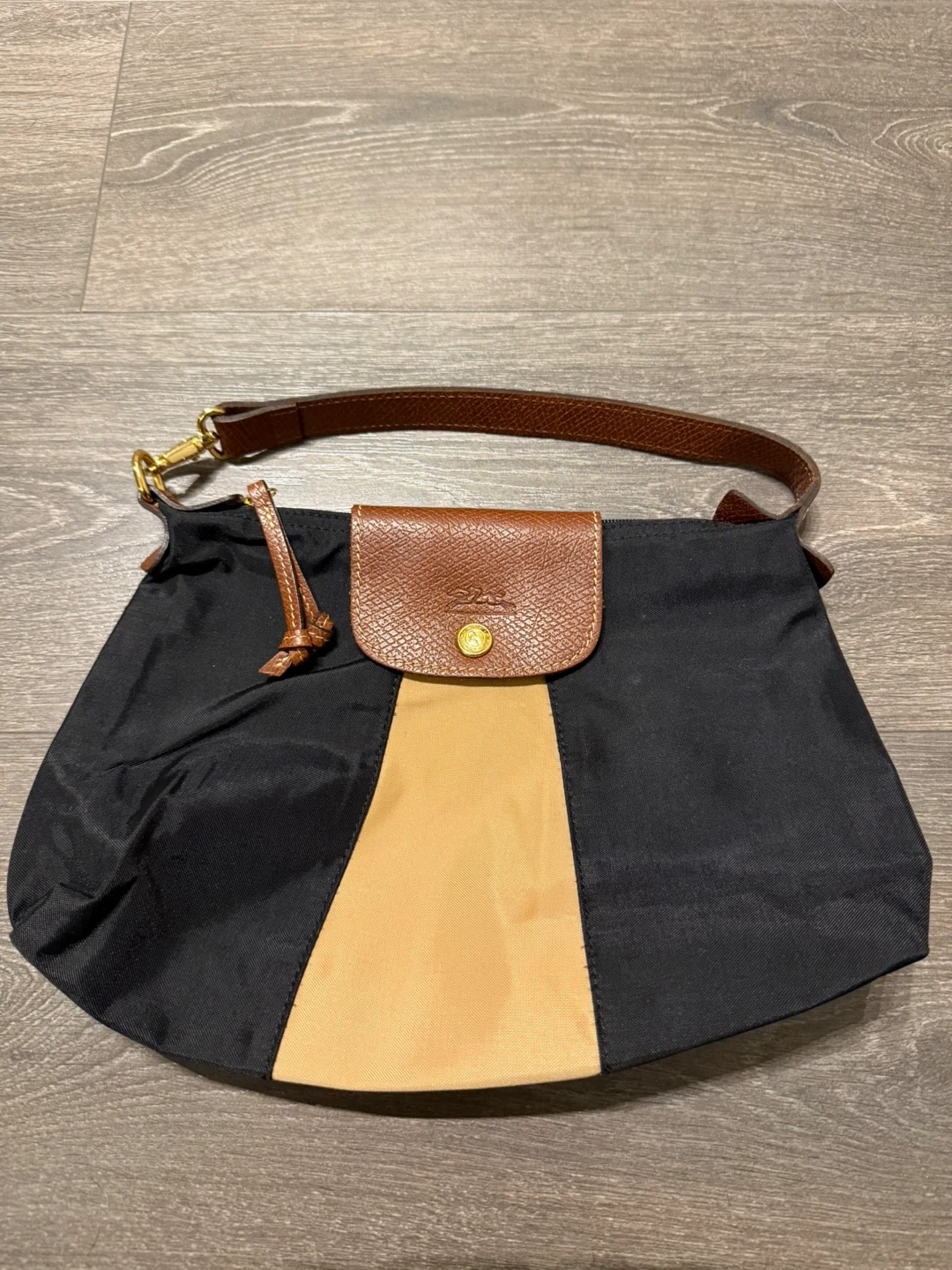 Longchamp Pliage shoulder bag mini in a stylish black and beige colour combination. It's in great condition and ready for a new home! The bag features a brown leather flap and strap, adding a touch of sophistication to its design. Perfect for everyday use or a night out 32 cm width - height 22 cm Made in France Like new great condition