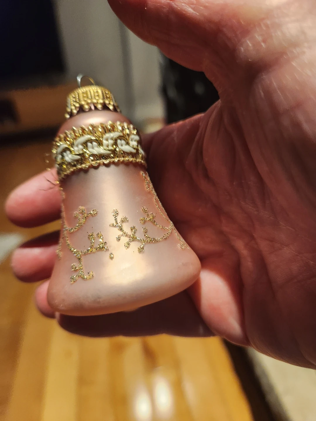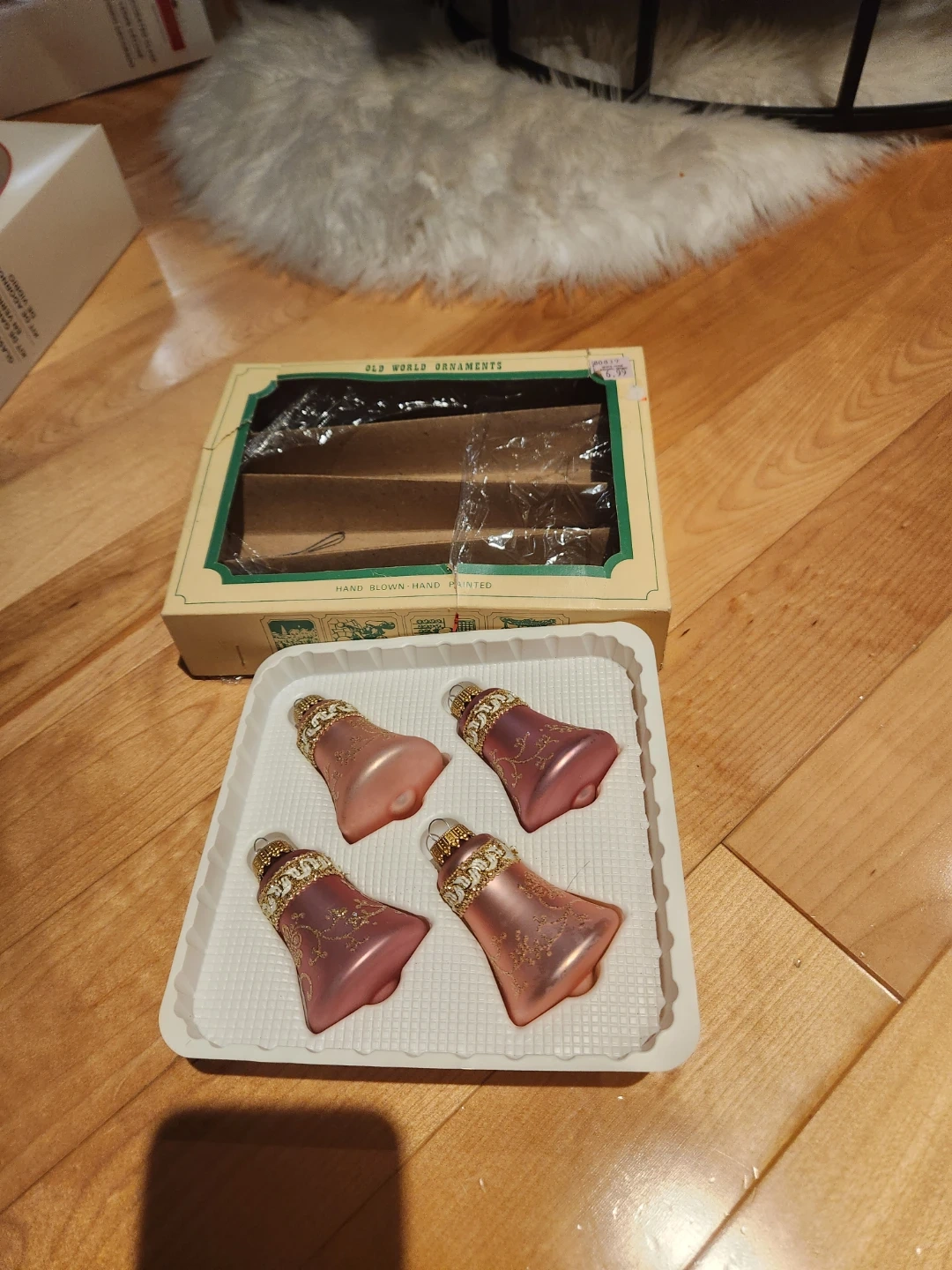 Selling a set of 4 Christmas by Krebs bell ornaments. They are hand-decorated glass with crowns and come in their original box. These ornaments are a beautiful addition to any Christmas tree!